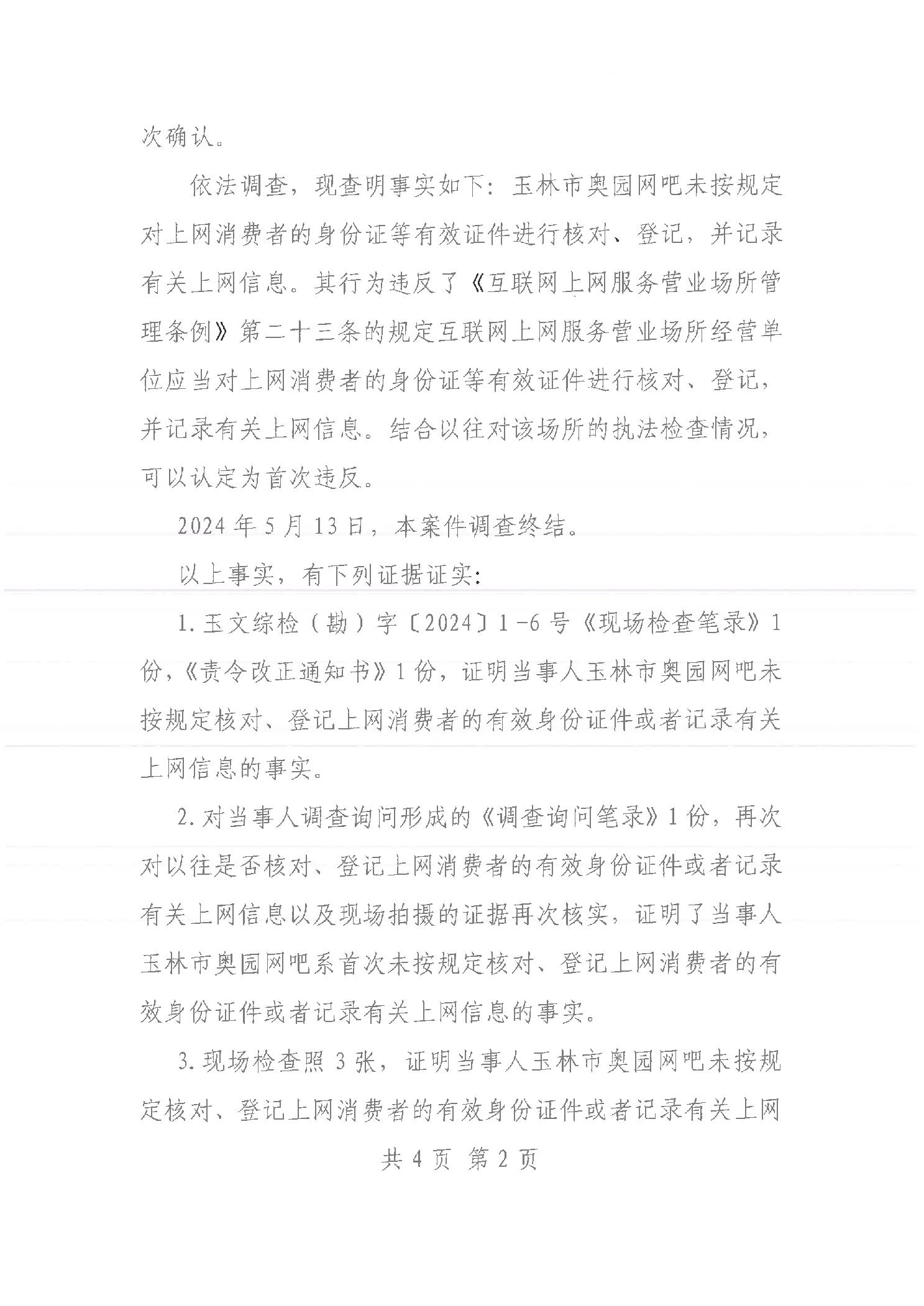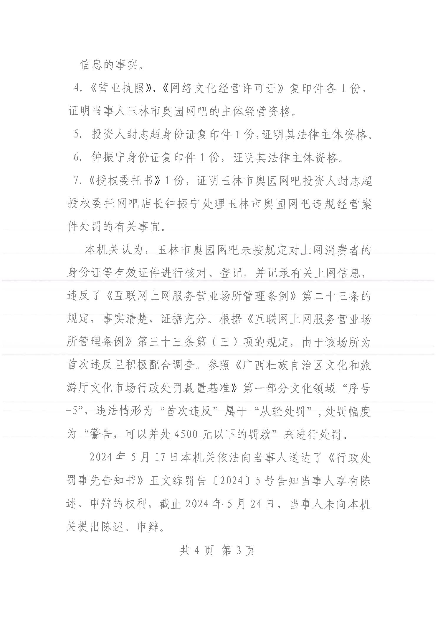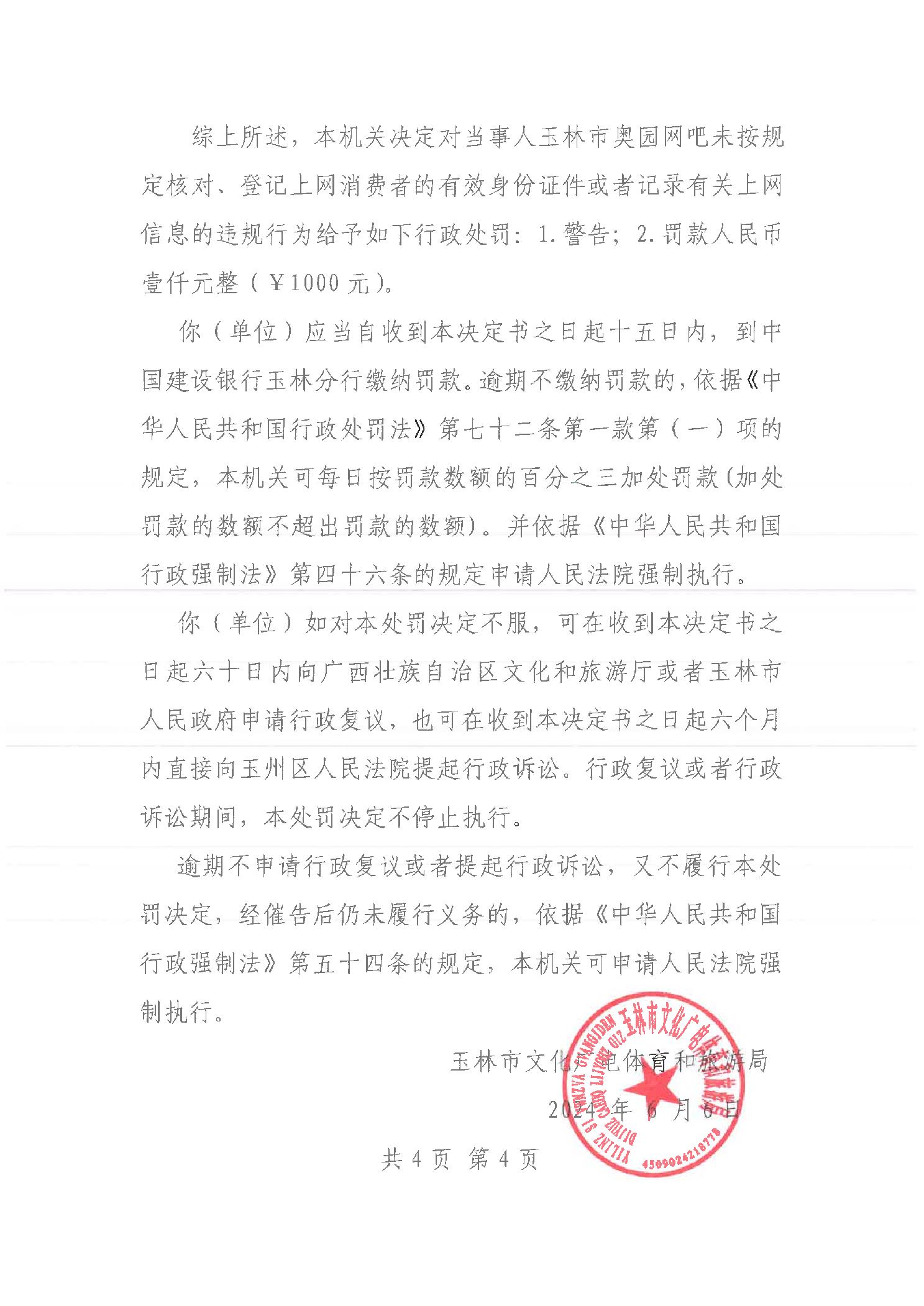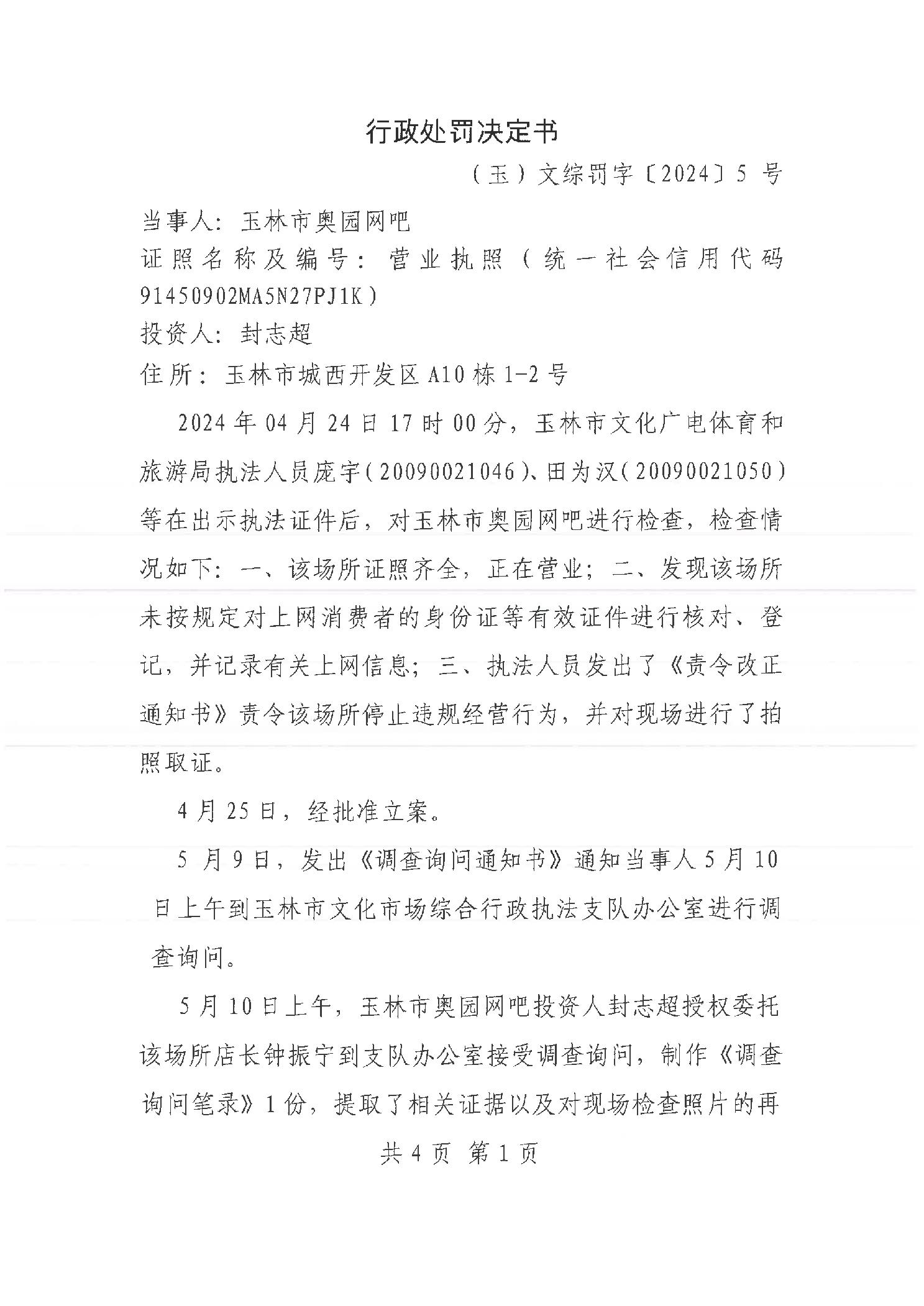 行政处罚决定书 (玉)文综罚字[2024]5号