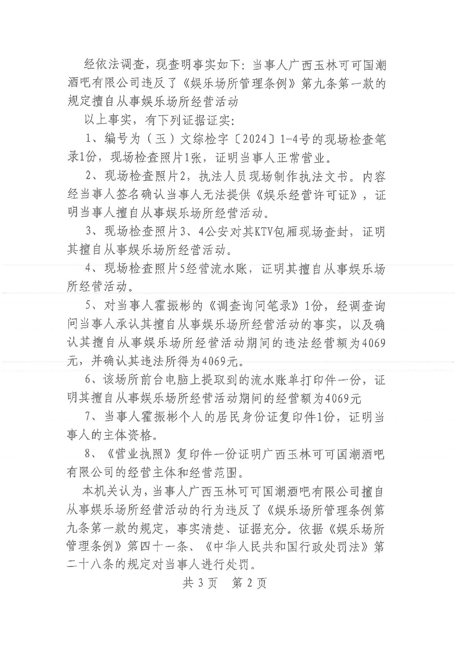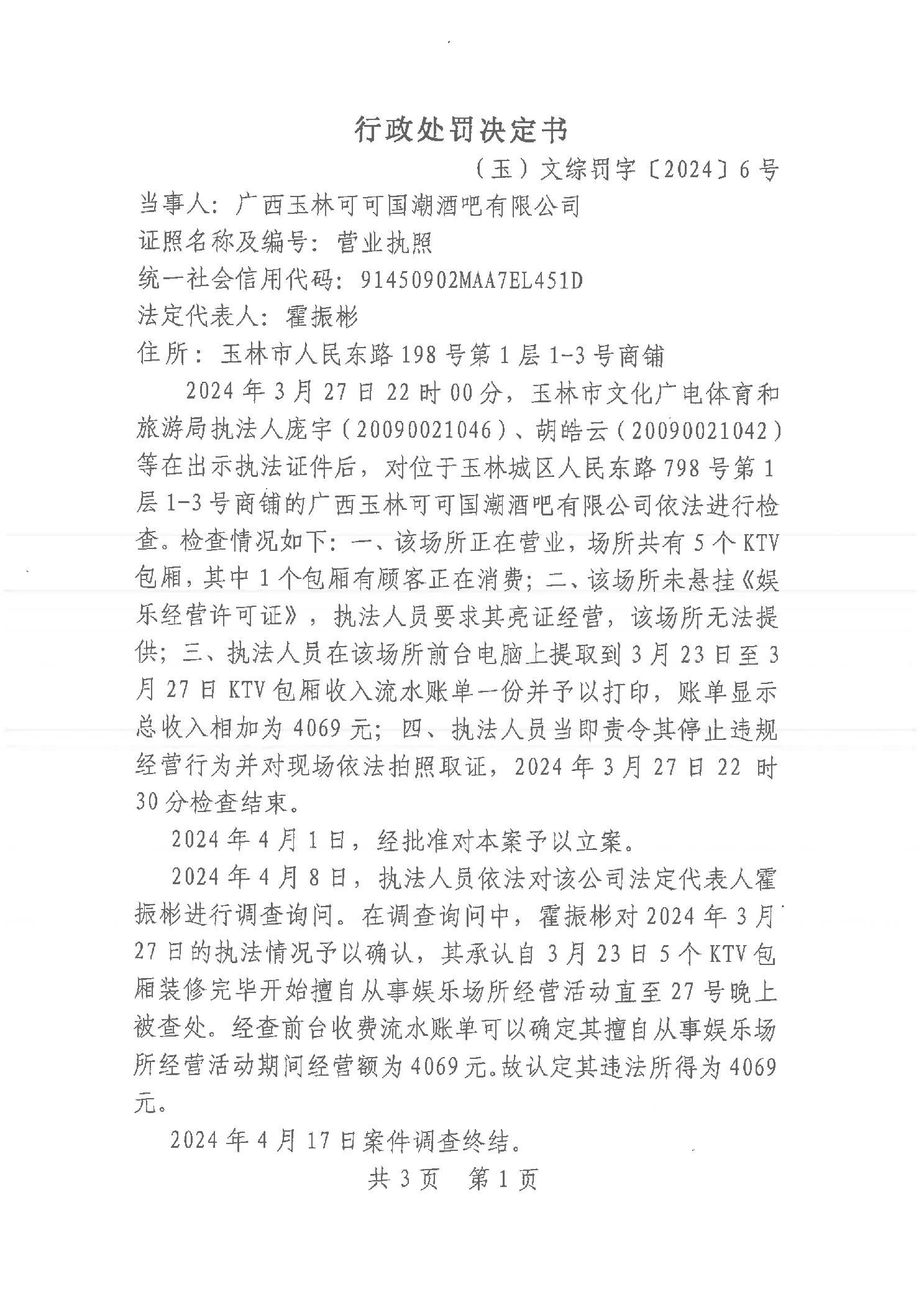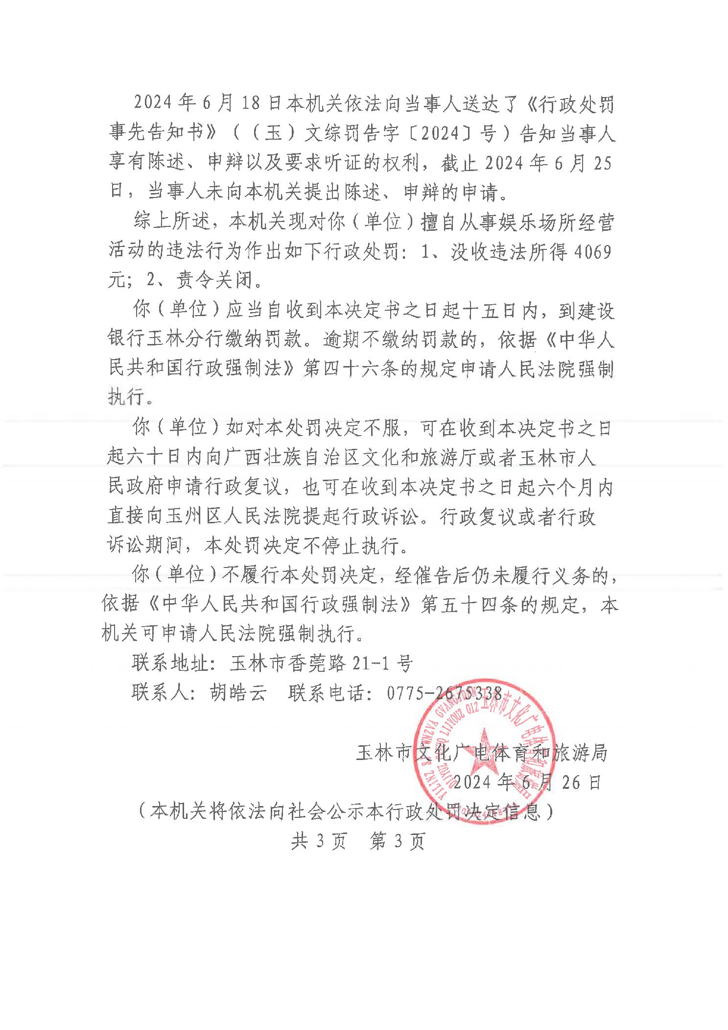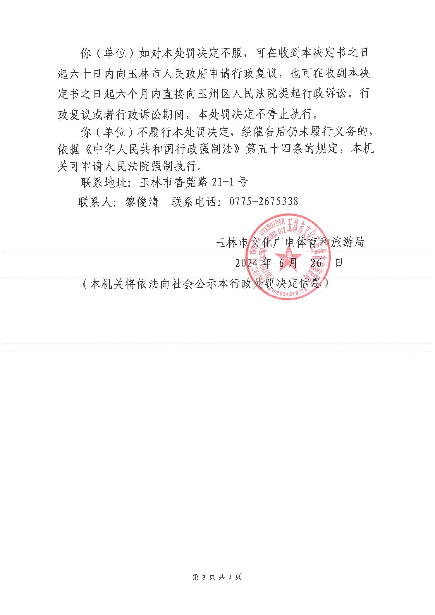 行政处罚决定书 (玉)文综罚字[2024]6号