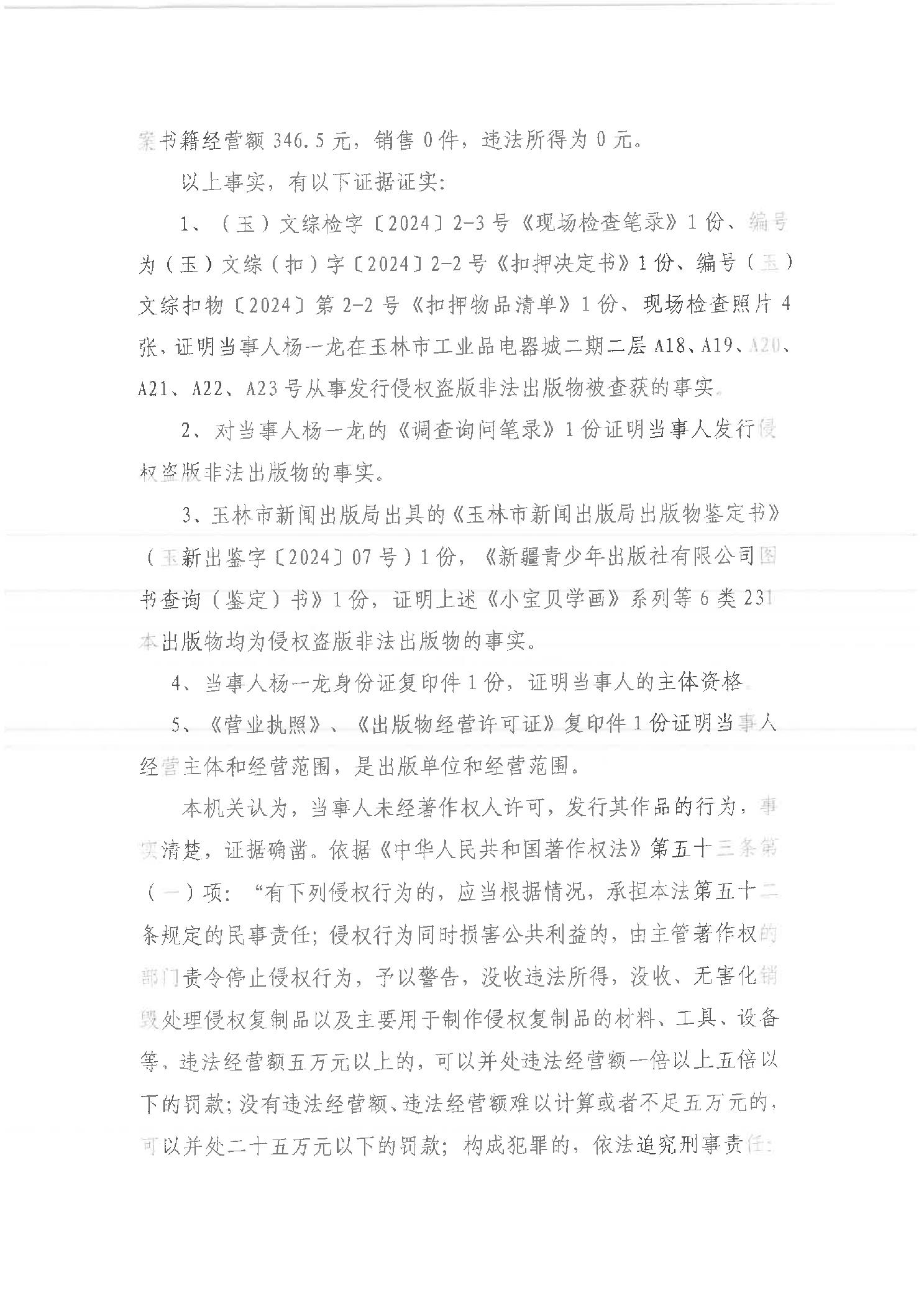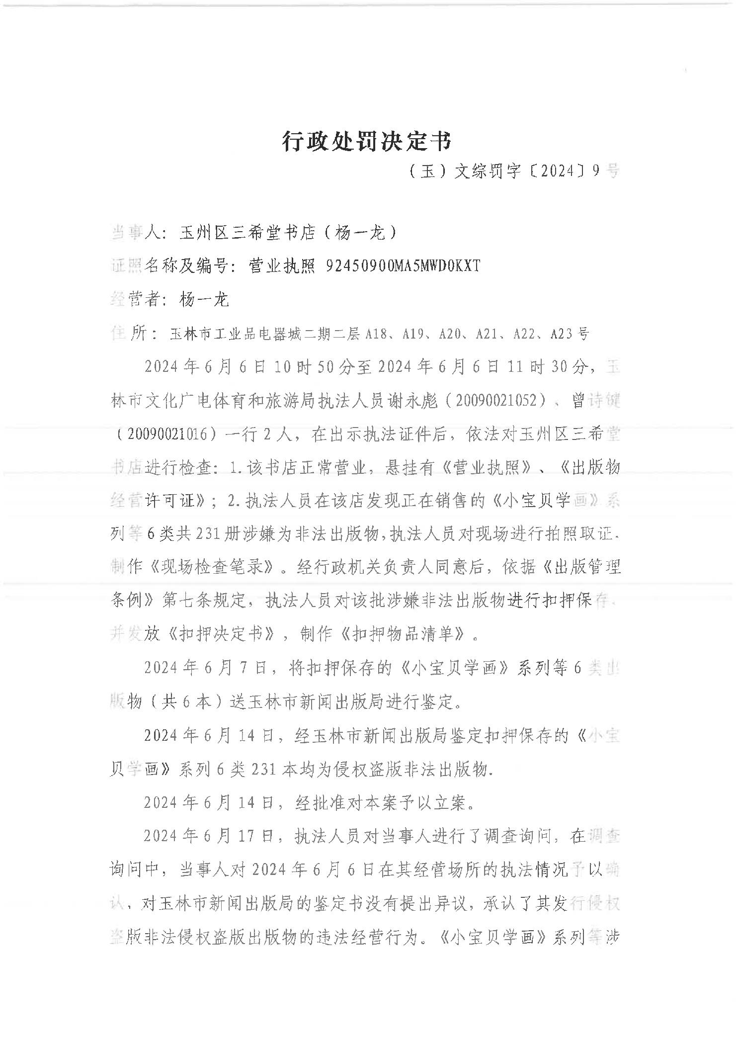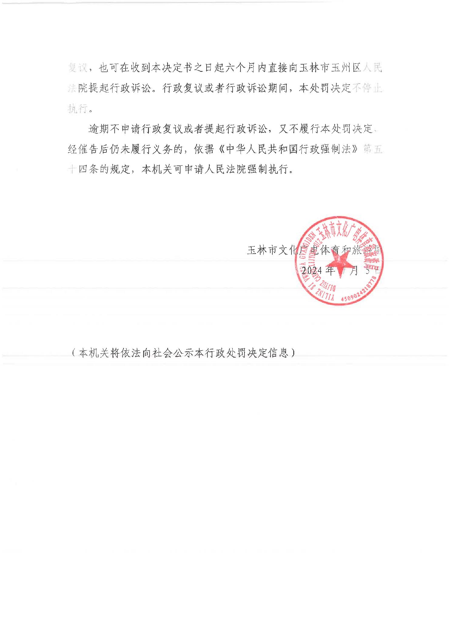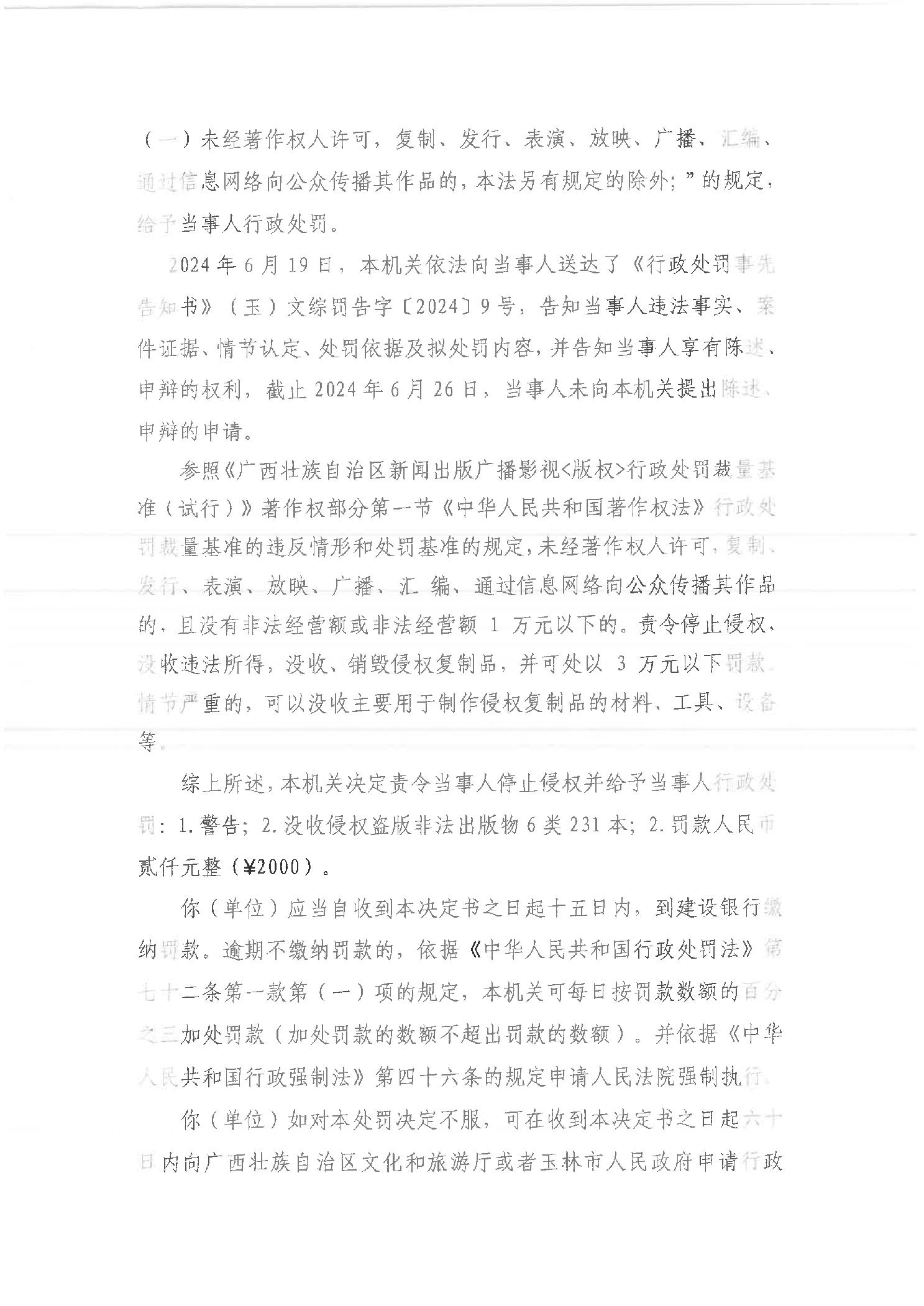 行政处罚决定书 (玉)文综罚字[2024]9号