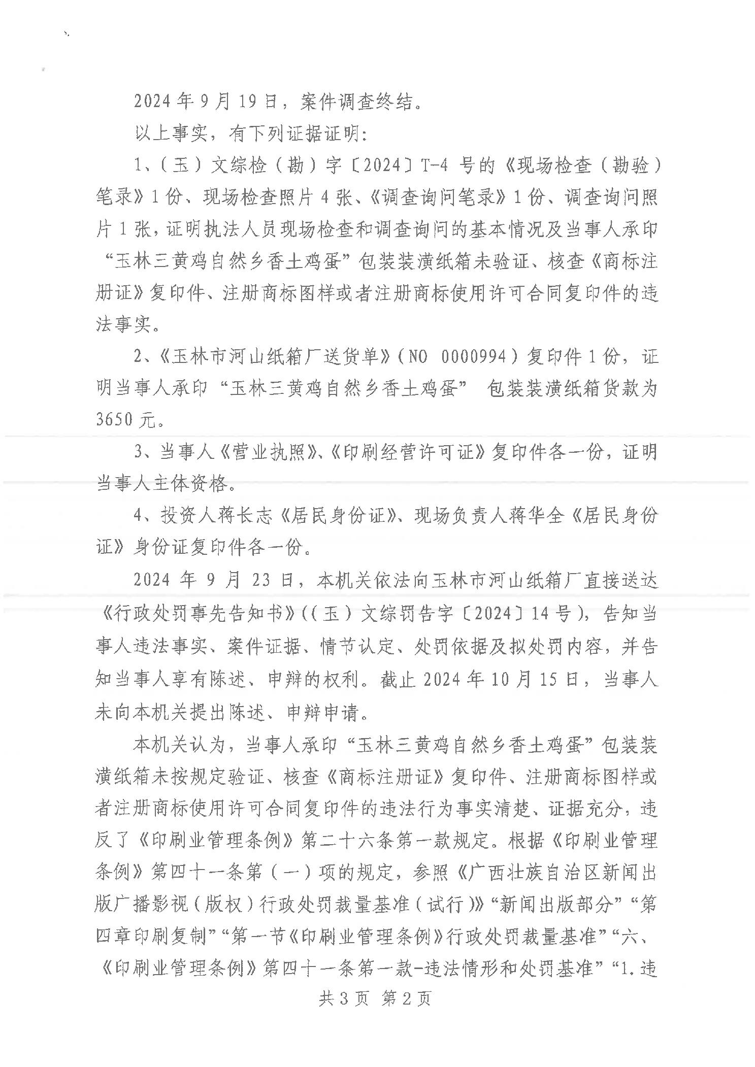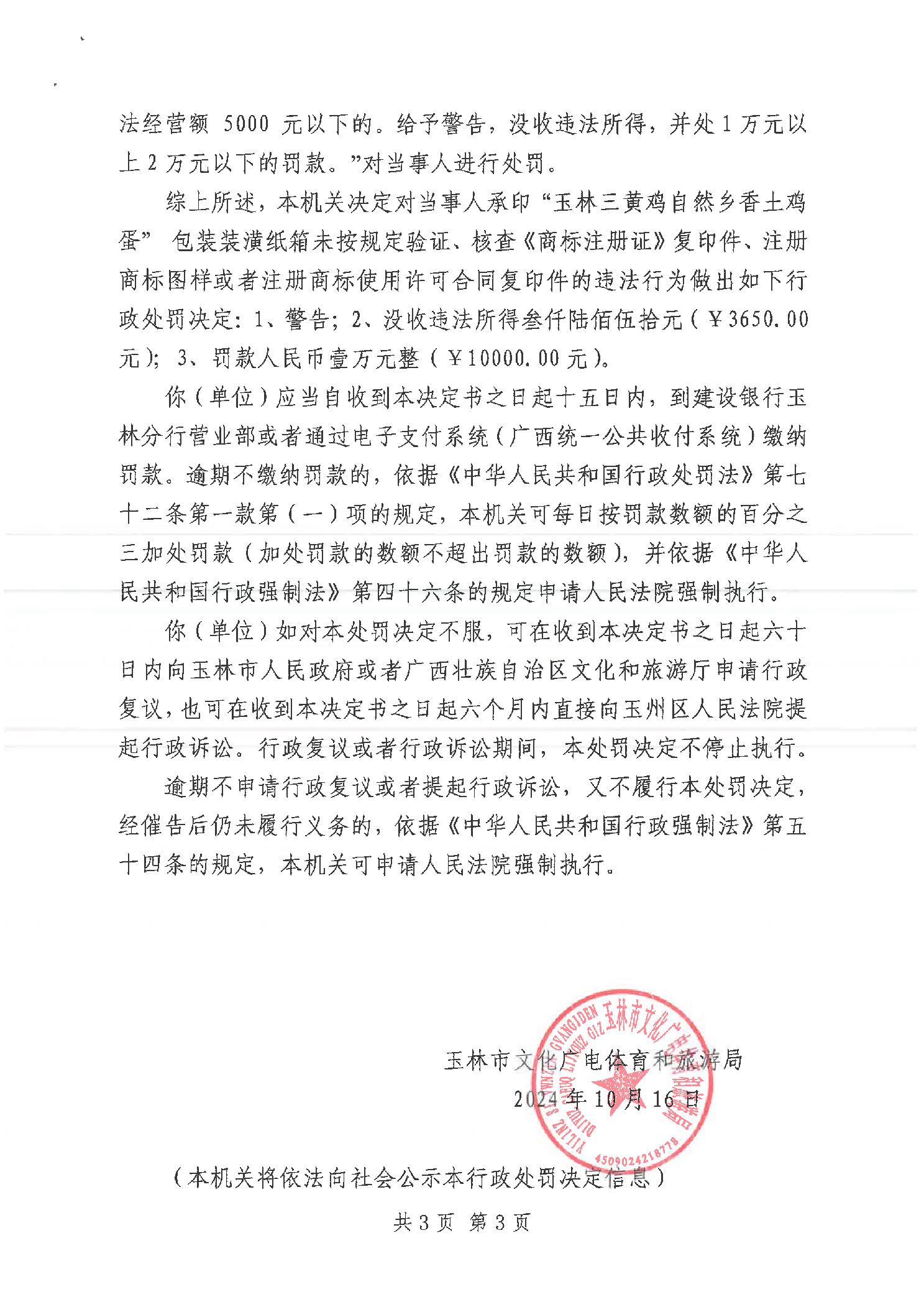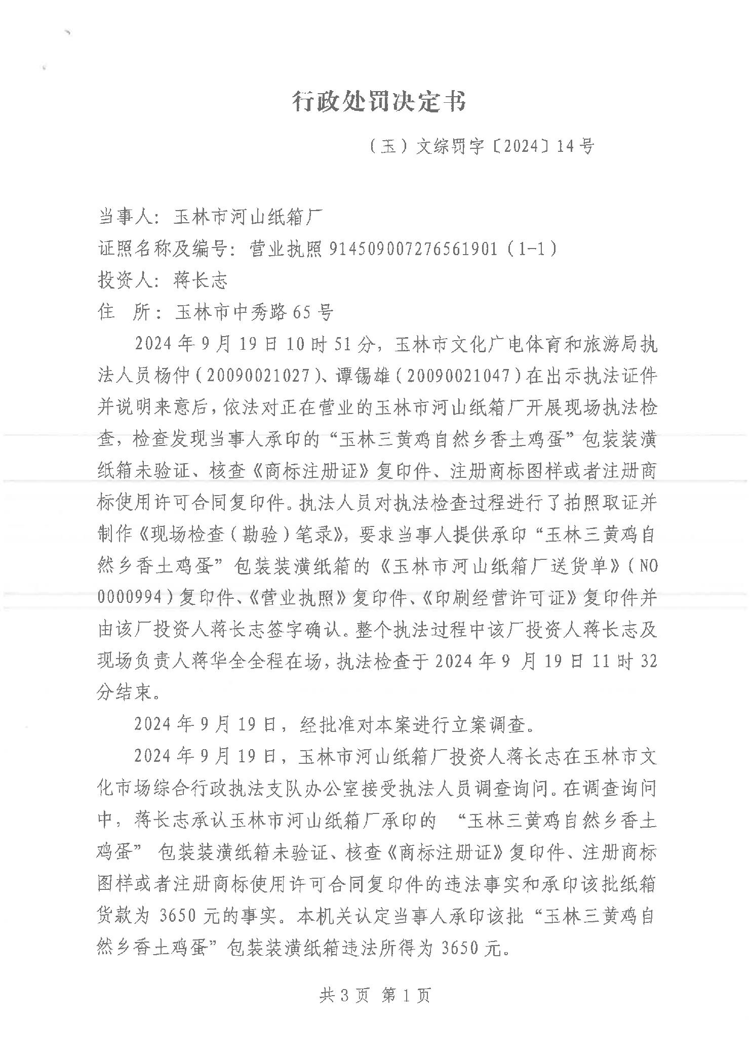 行政处罚书(玉)文综罚字[2024]14号