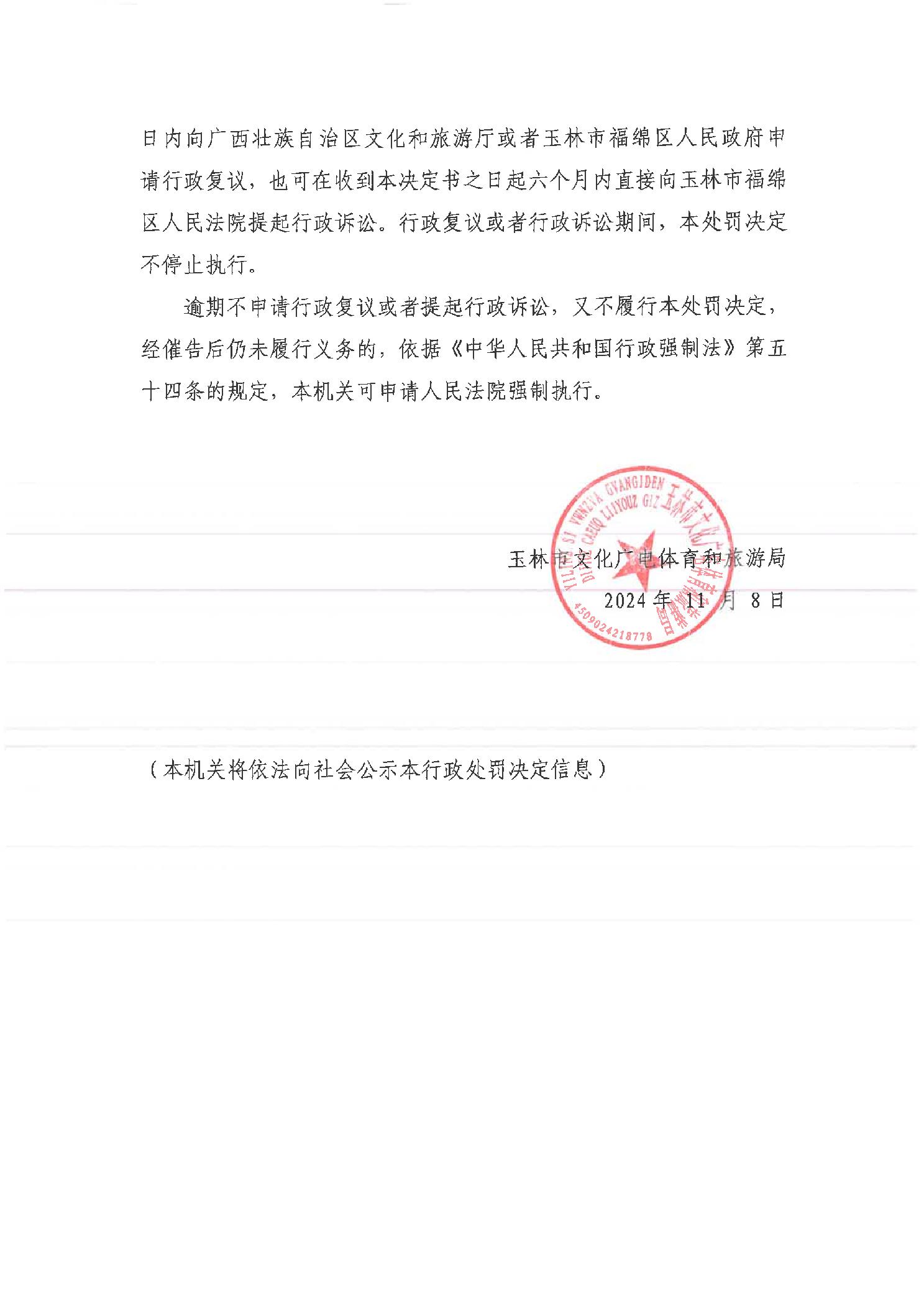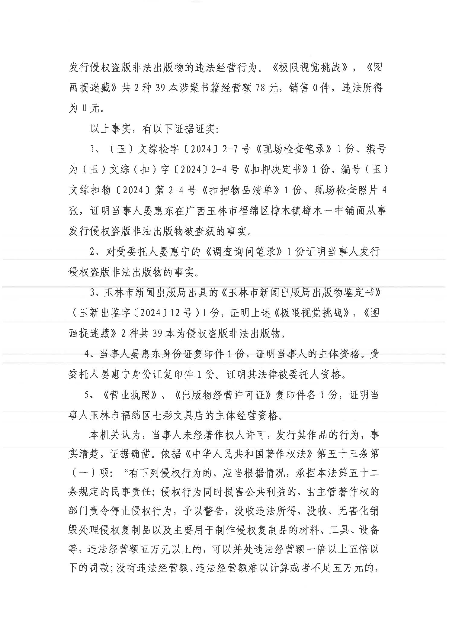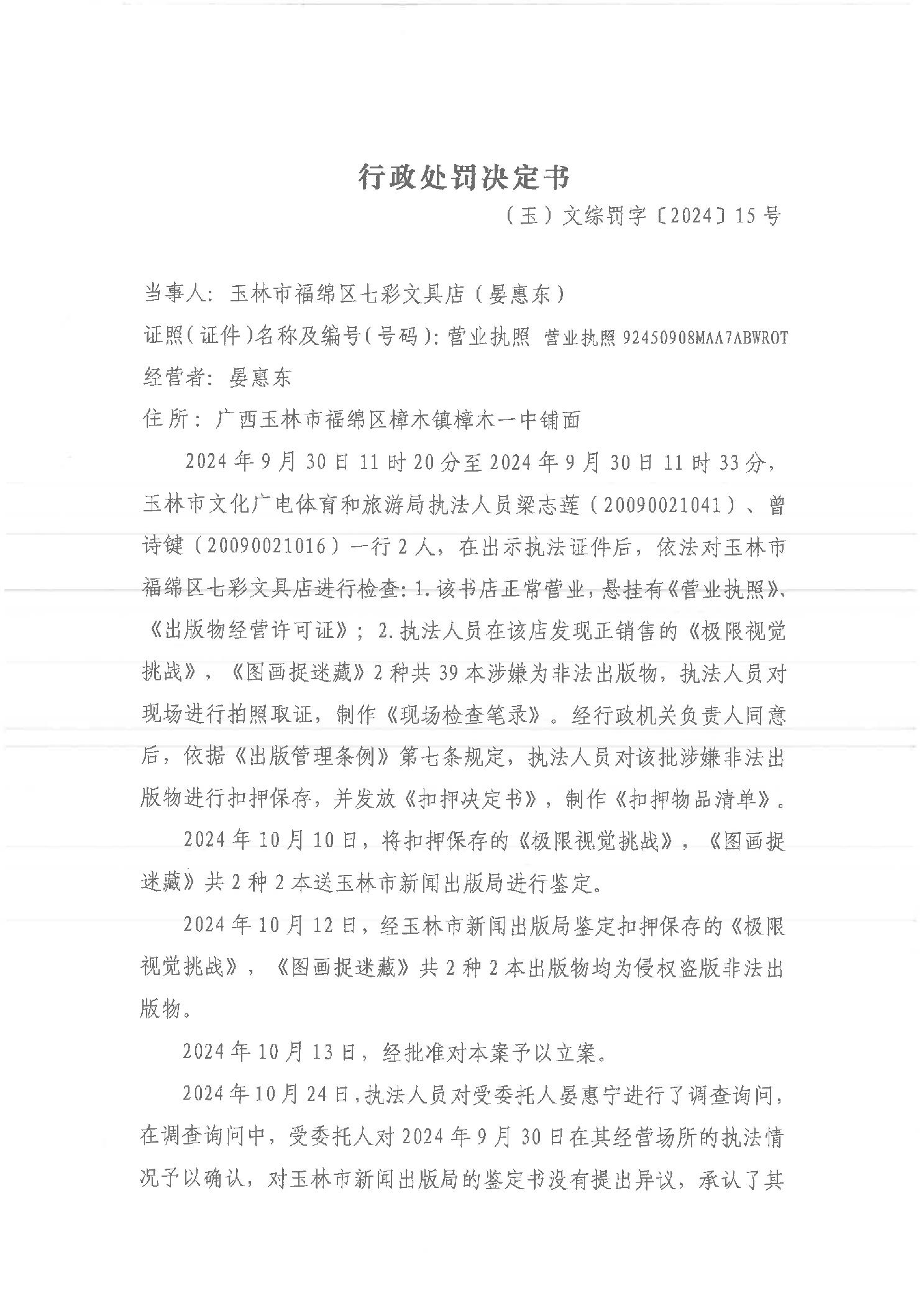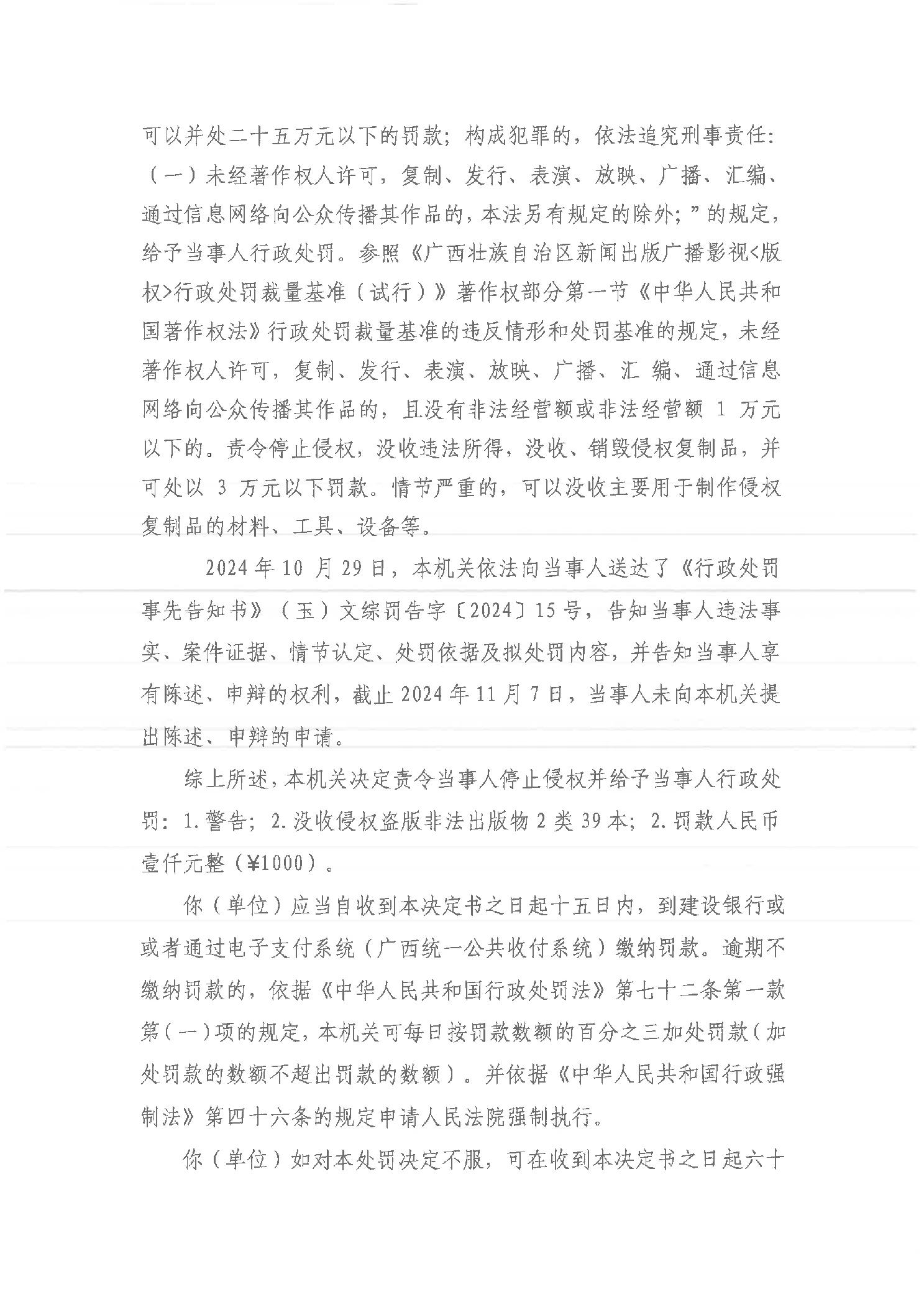 行政处罚书(玉)文综罚字〔2024〕15号