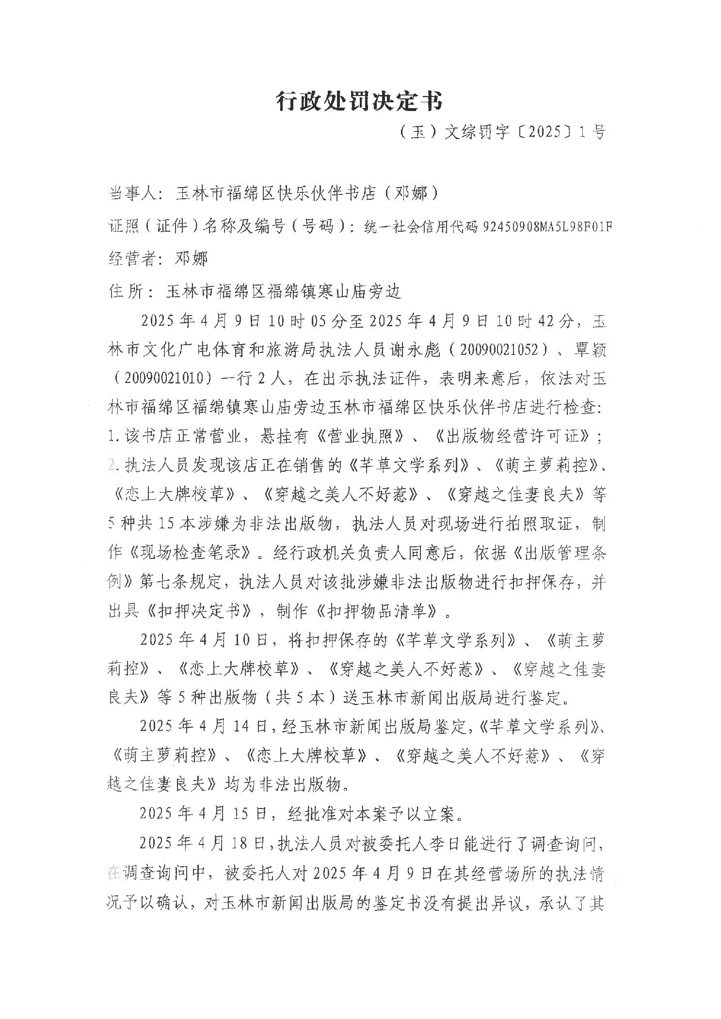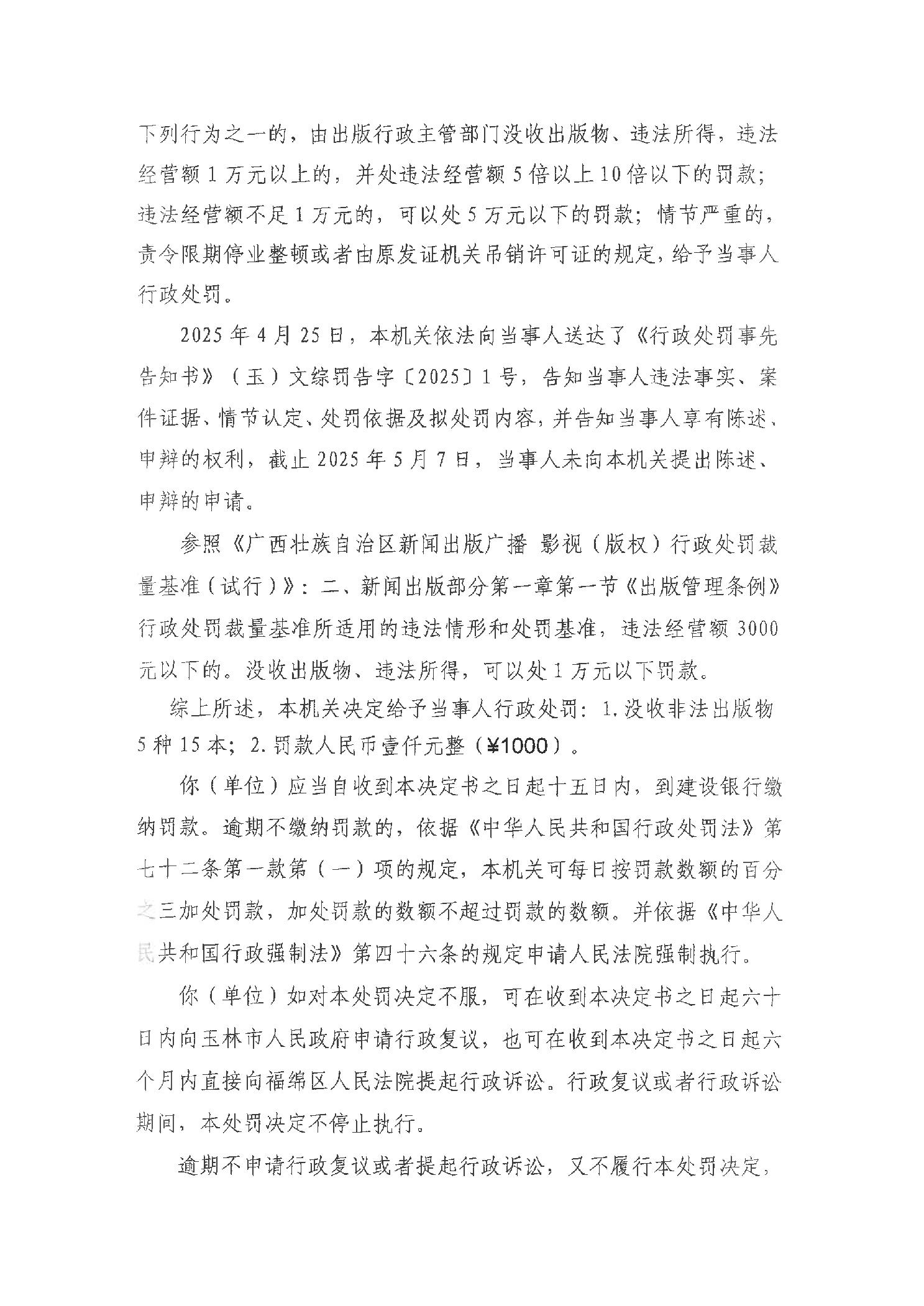 行政处罚决定书(玉)文综罚字〔2025〕1号