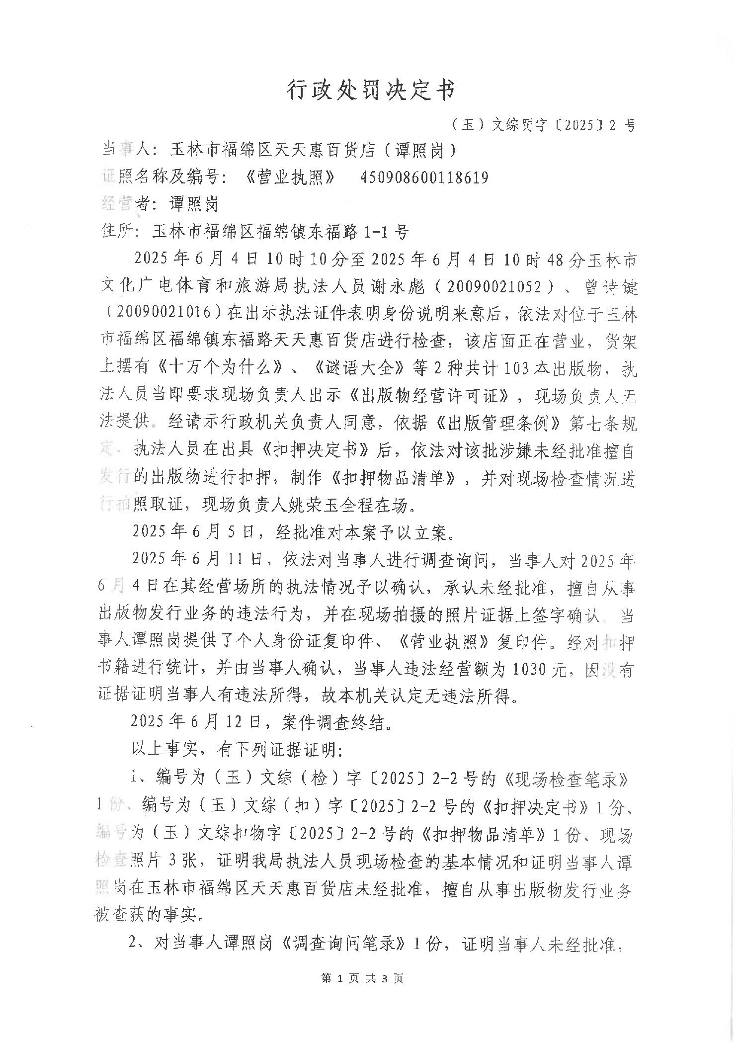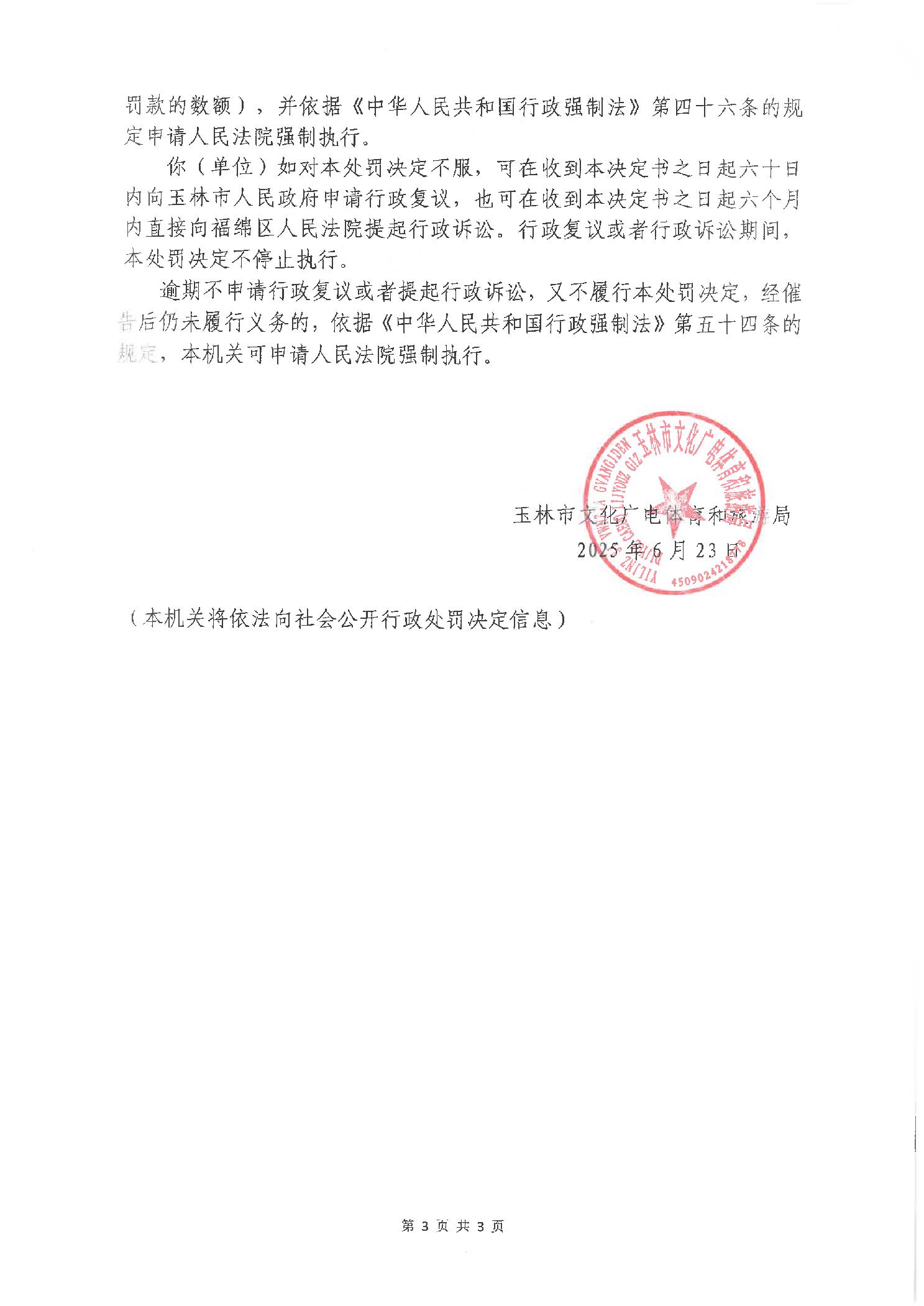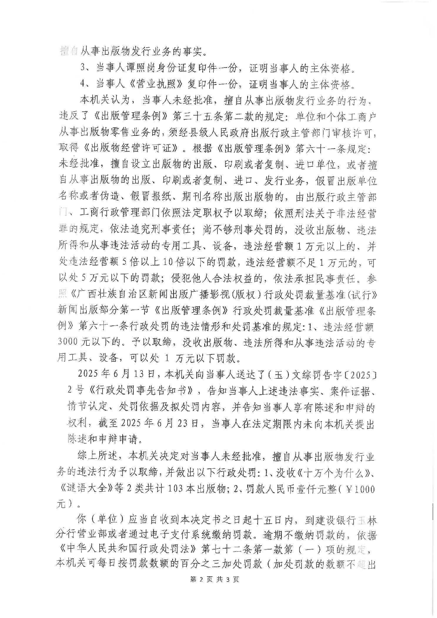 行政处罚决定书 (玉)文综罚字〔2025〕2号