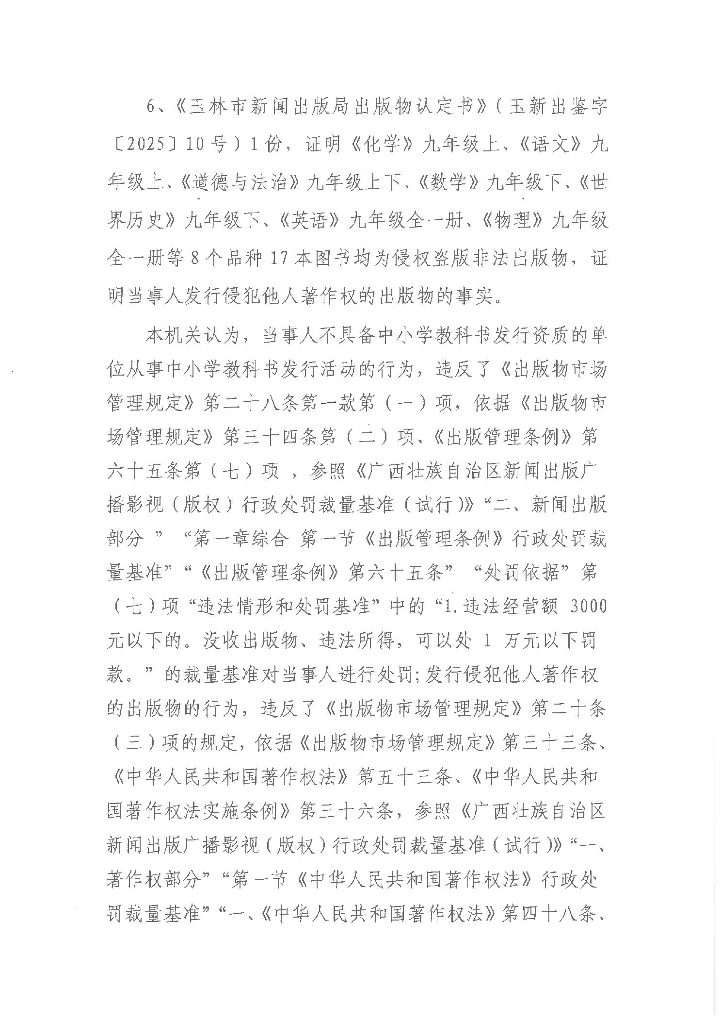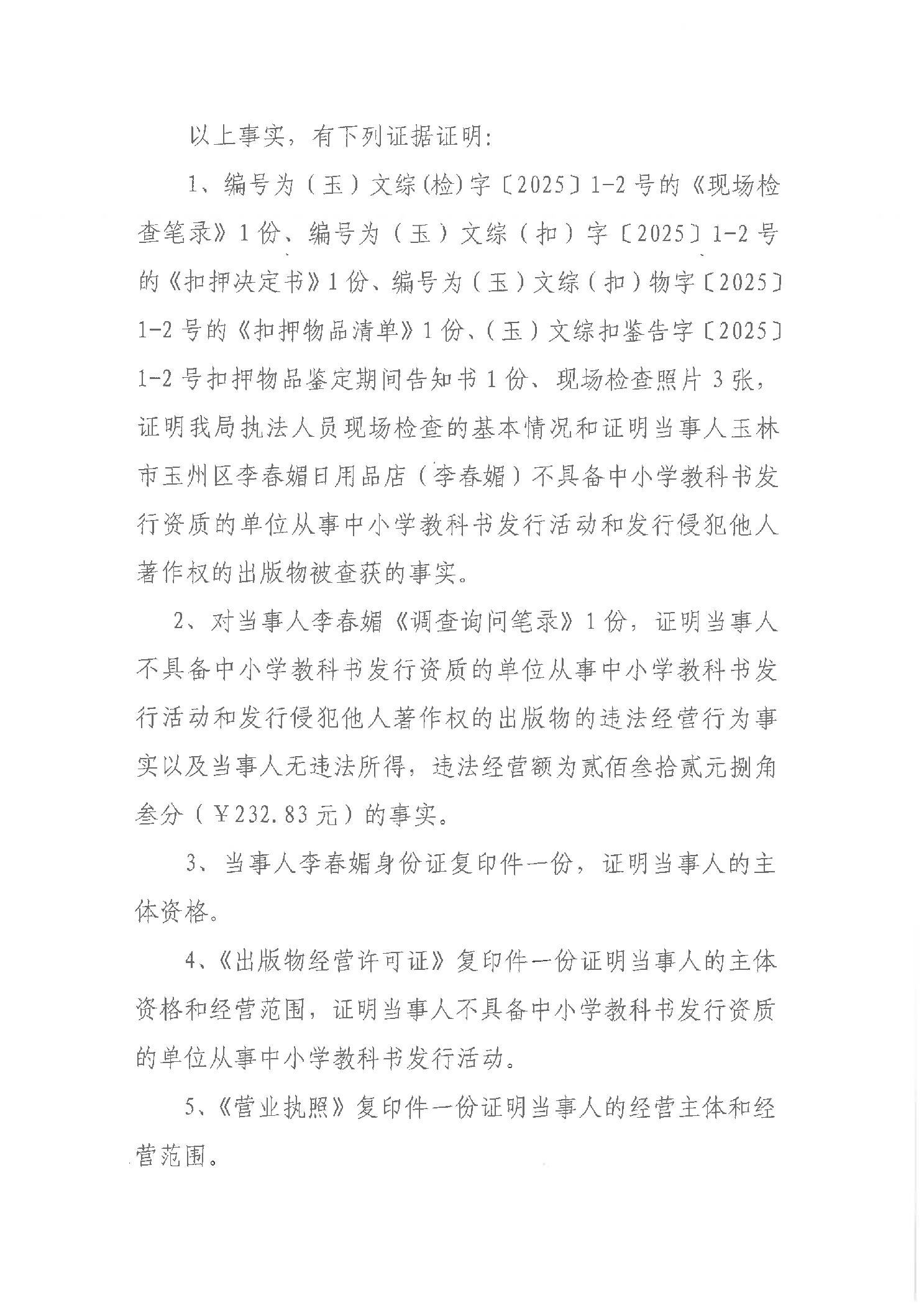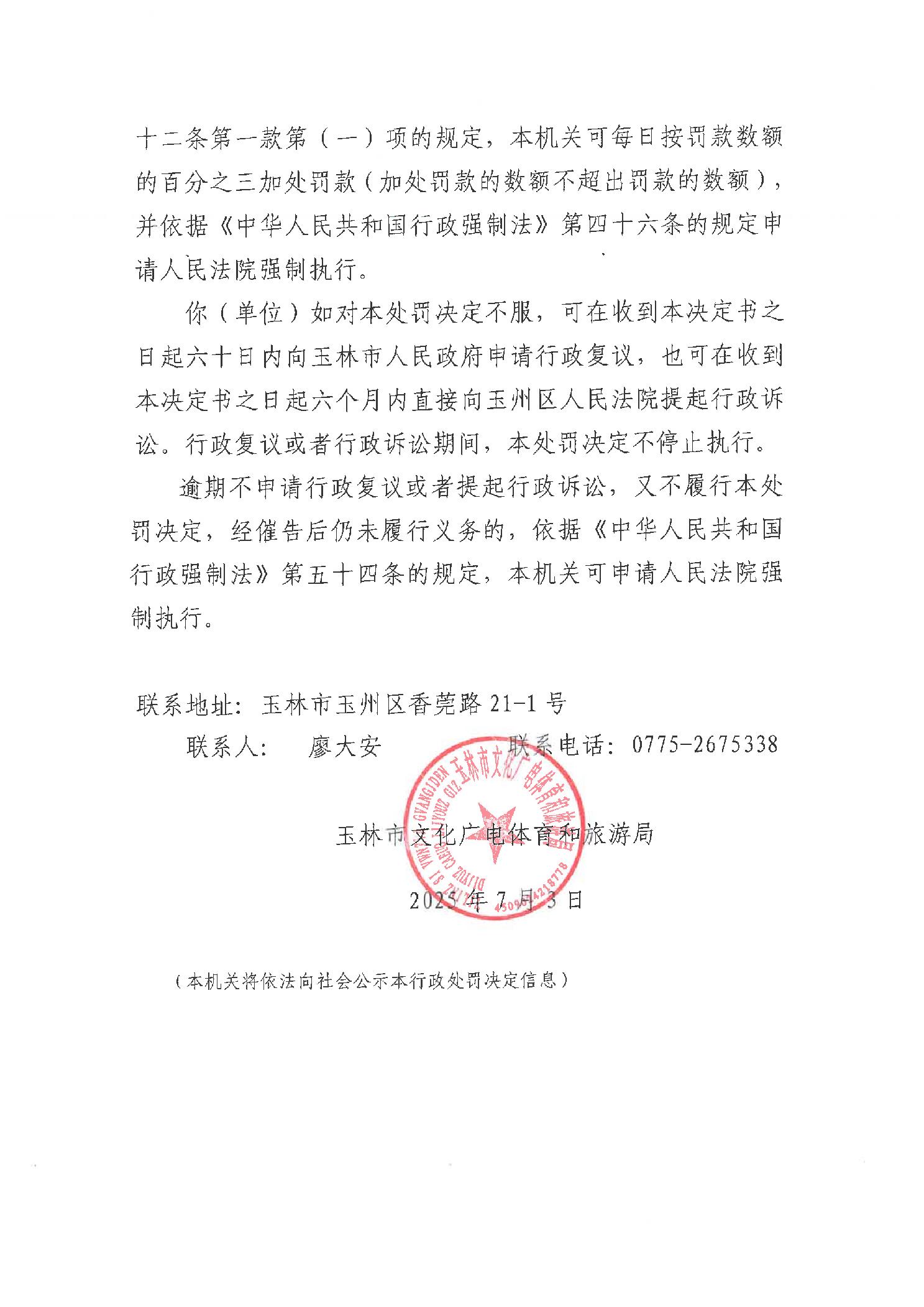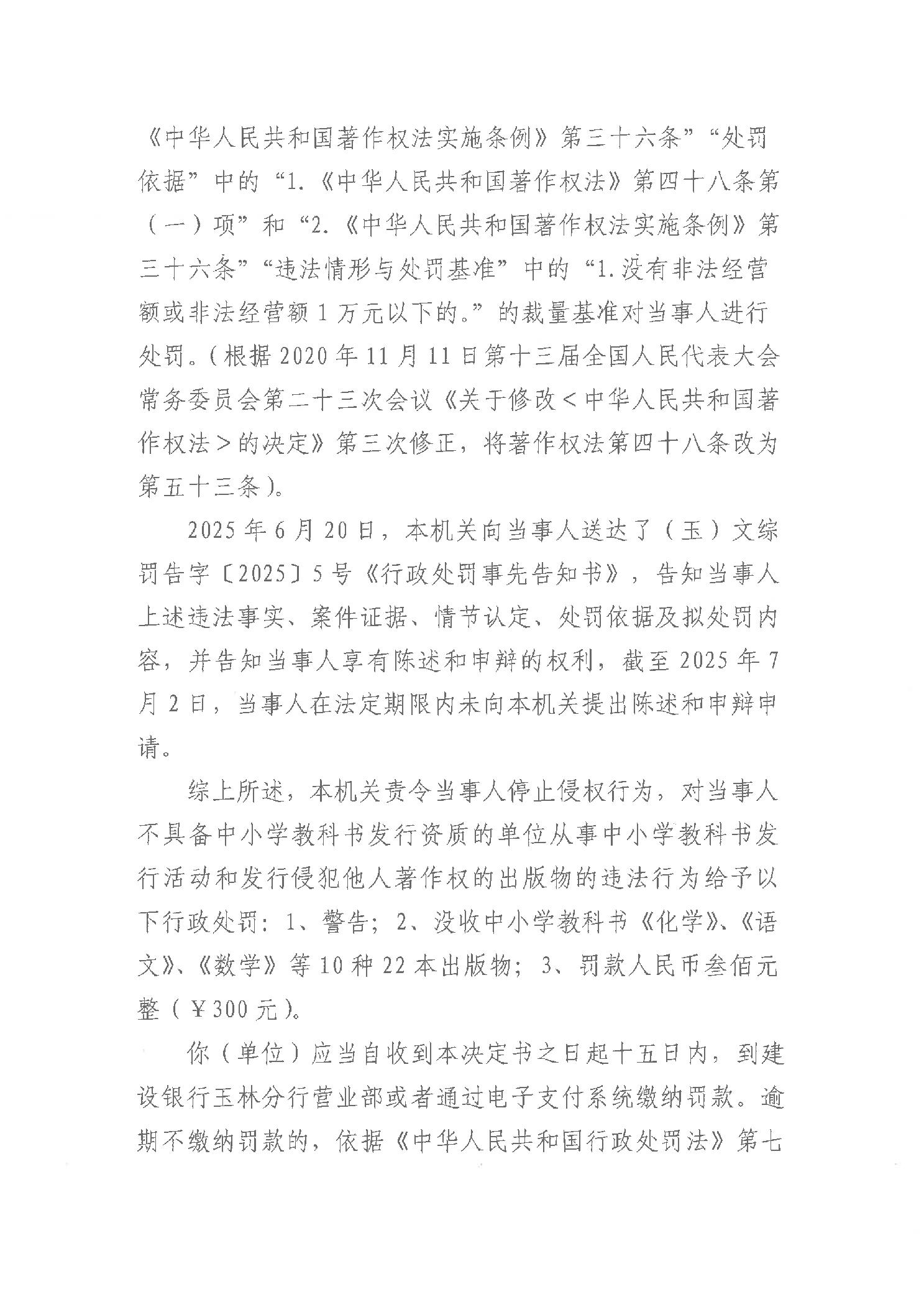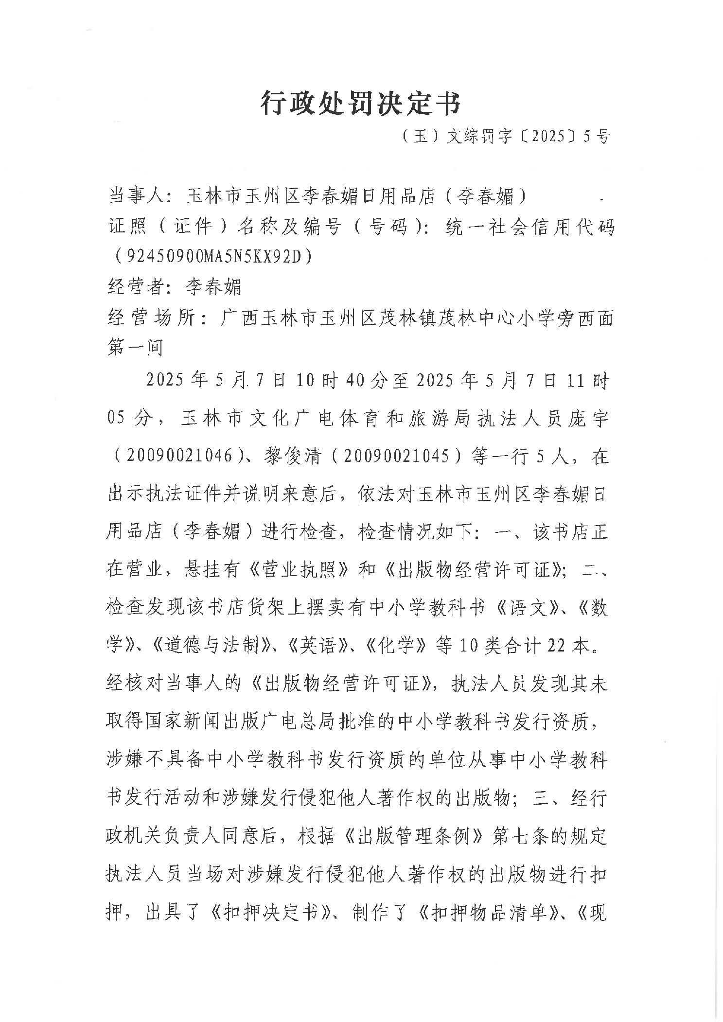 行政处罚决定书 (玉)文综罚字〔2025〕5号
