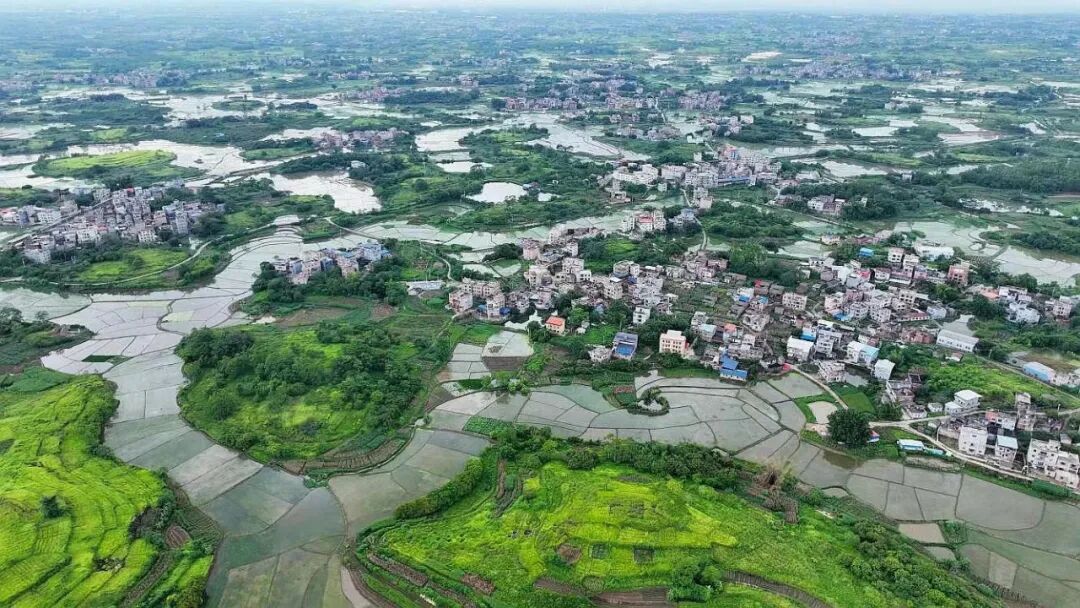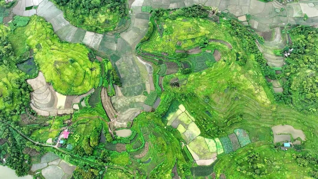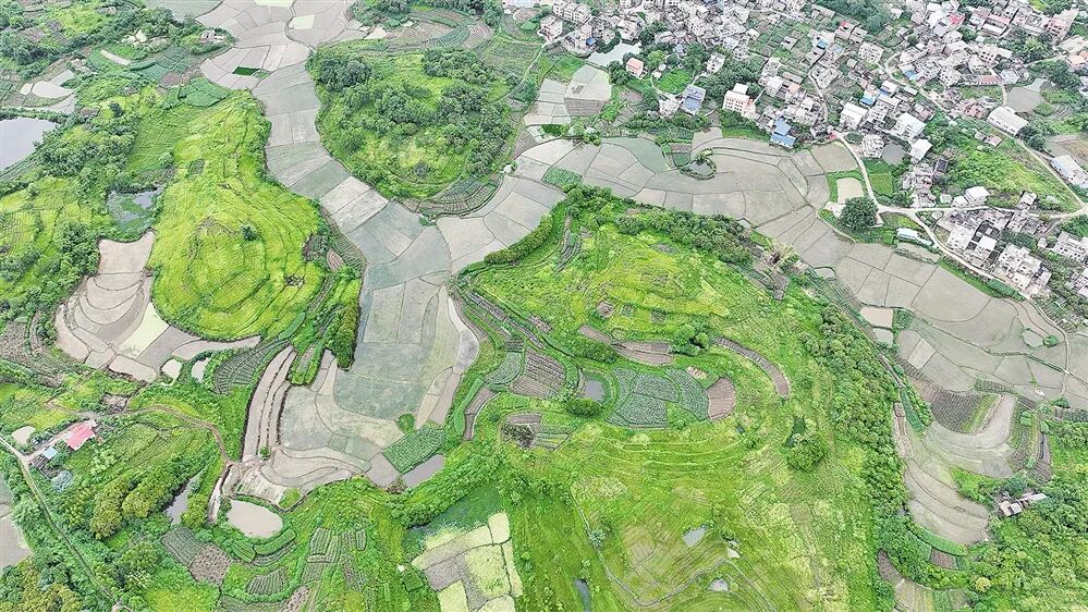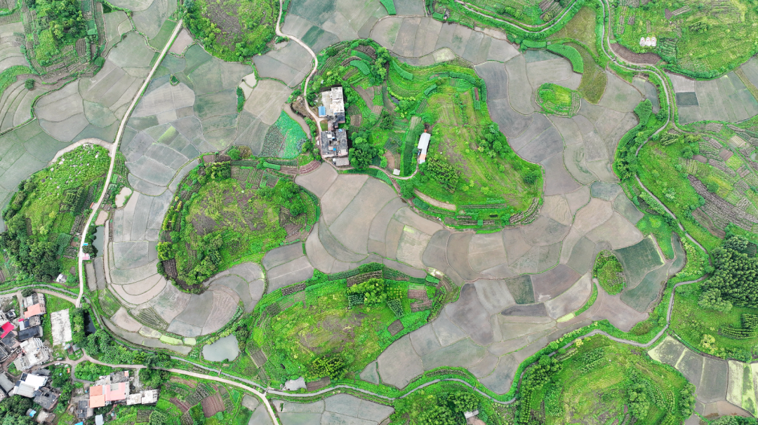 从空中鸟瞰,稻田呈现深深浅浅的绿色,像是给大地铺上一层绿毯。刚插完秧的稻田蓄满了水,使一块块的绿毯形成一个个美丽的“岛屿”。
