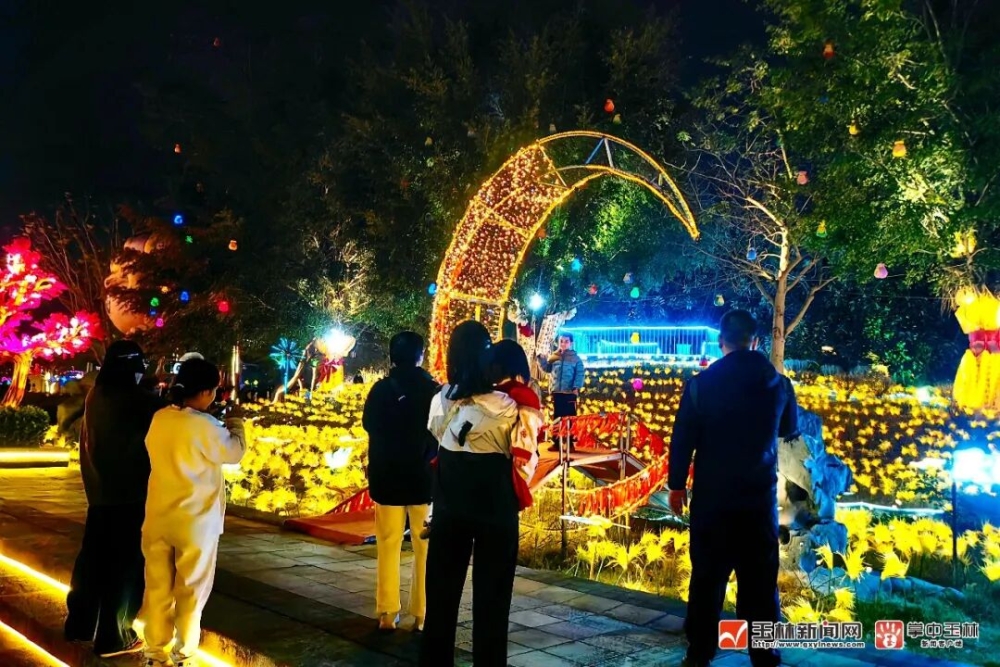 走进玉林园博园第三届新春灯会大门,几匹颜色各异的“骏马”踏在“高山”上跃入游客眼帘,紧扣农历马年主题。游客们竞相与“骏马”合影。“这里的灯会盛景,让人恍若置身仙境,太美了。”来自湖北的游客王女士说,她来玉林和儿子一起过年,看到玉林园博园晚上灯火辉煌,美不胜收,“一下子就感受到了玉林人的快乐”。