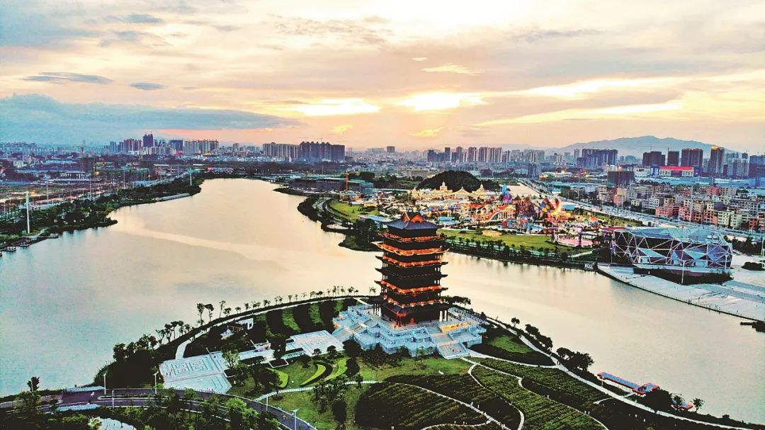 皎洁的月光倾泻在玉东湖上,如同披上了一层轻柔的面纱,呼吸之间,玉林园博园里霓虹闪烁,与月光交相辉映,使这夜色变得更加迷人。