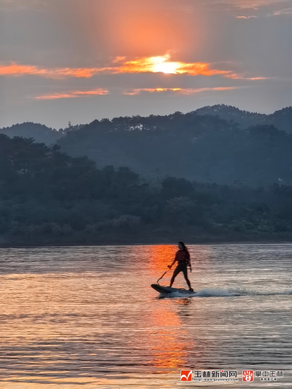 水上运动员的矫健身姿在夕阳的映照下成为美妙的剪影。
