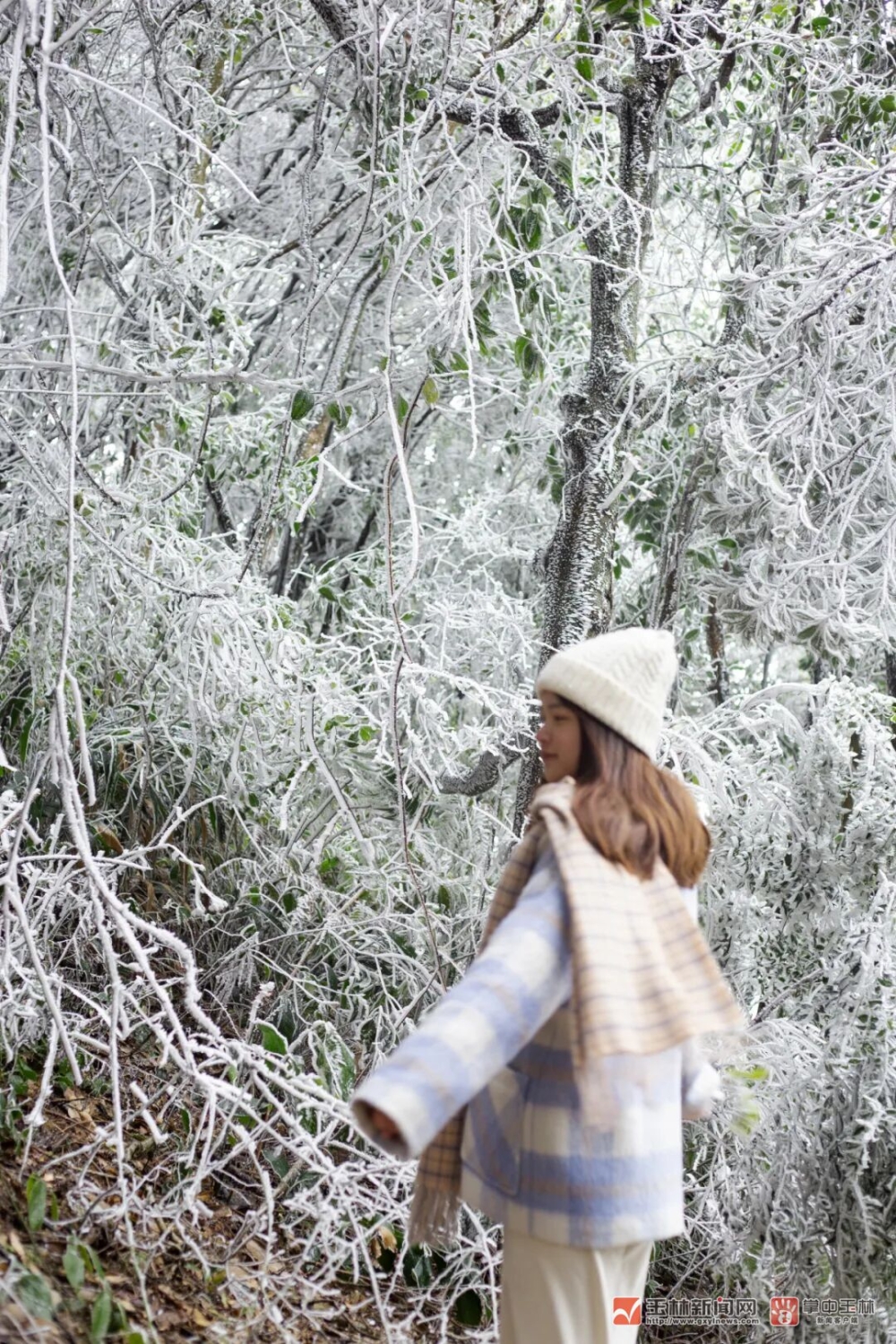 游客近距离欣赏雾凇。