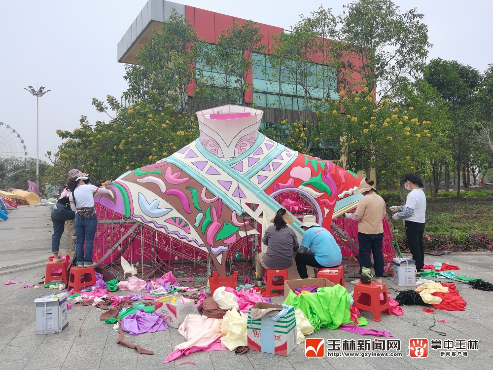 11月26日,记者在园博园飞虹桥南侧看到,不少花灯已经运送到位,摆放在空地上,不少工人正在对刘三姐半身灯饰像裱糊、彩绘喷色。相关负责人告诉记者,此次花灯规模和档次均比去年有很大提升,就以现在制作的这个刘三姐灯饰造型为例,半身像有8米高,加上配饰约有20米宽,真可谓“巨无霸”。制作完成的灯组造型在经过检验确认无误后将即刻被转移至灯会园区内,进行现场布置与灯带安装等作业。