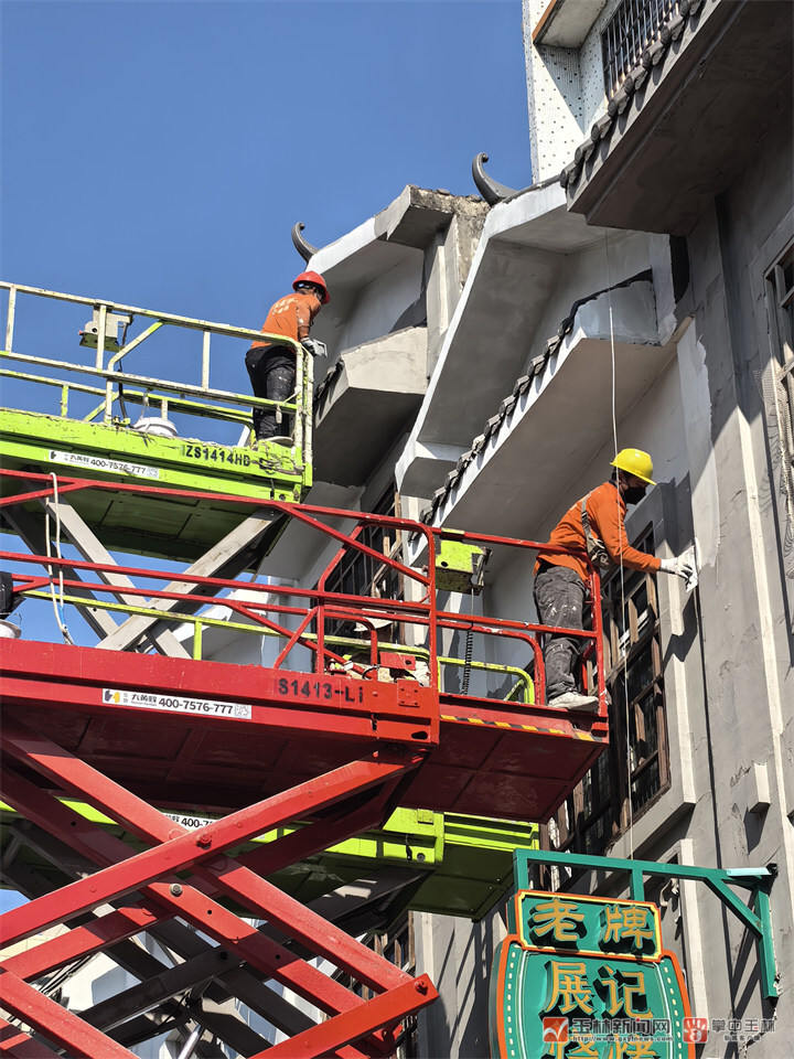 工人正在沿线建筑外立面进行刷墙、喷漆、雕花等作业。