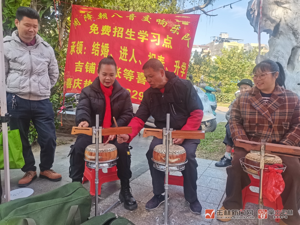 岁月流转中,周降朝的演奏技艺日益精湛。2008年至2012年,他加入玉林市粤剧团负责击乐演奏,将八音韵律与戏曲节奏深度融合,技艺更上一层楼。走出剧团后,他受邀加入广东多个民间乐团,足迹遍布湛江、贵港、桂平、平南等地,让玉林八音的旋律跨越地域边界。“最多一天能接10场演出。”如今,他开通抖音接单,订单已排至2026年正月十六,婚庆、挂灯、祝寿等各类民俗活动,都少不了他的八音班子。而“敬业”二字,正是他收获无数客户点赞的秘诀。2026年正月十五,他还将受邀前往广东遂溪,在庙会上奏响玉林八音的古韵新声。