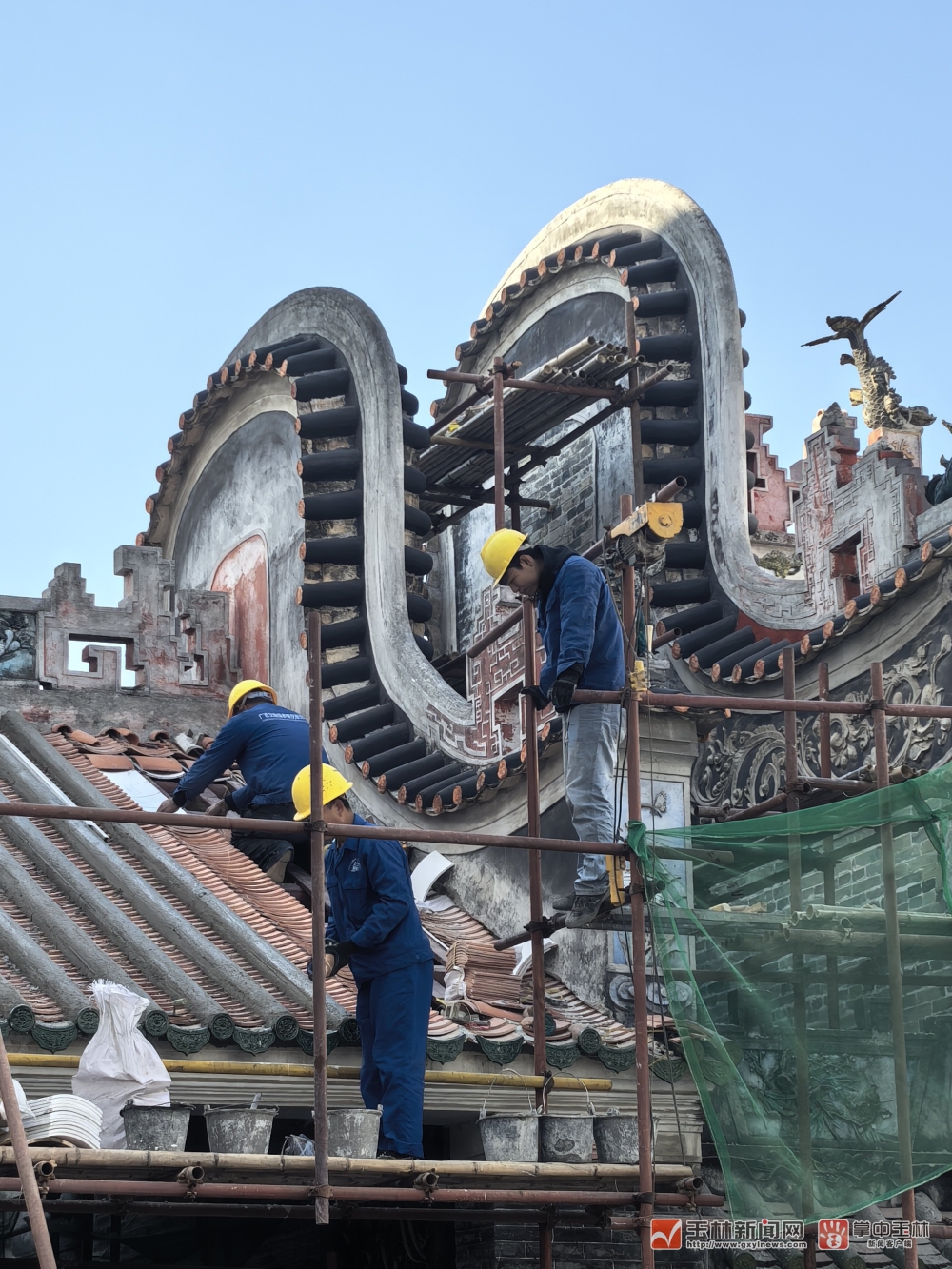 工人对玉林粤东会馆的屋顶、墙体进行维修。