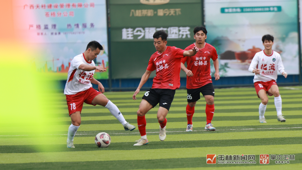 北流市队队员李俞球(左一)带球试图摆脱对方球员的防守。(潘绍珊 摄)
