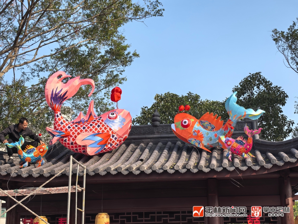 工人在凉亭屋顶装上鲤鱼灯饰。