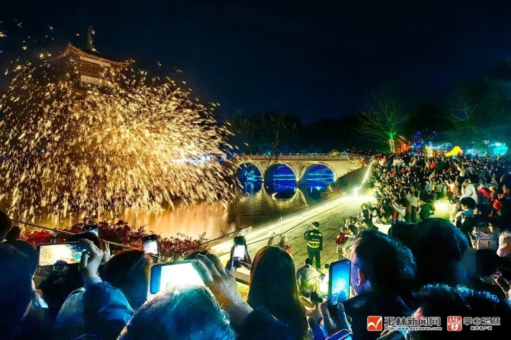 2月17日晚,在玉林园博园第三届新春灯会&仙侠奇缘活动上,上演的非遗节目打铁花吸引了众多游客驻足欣赏,共贺新春。