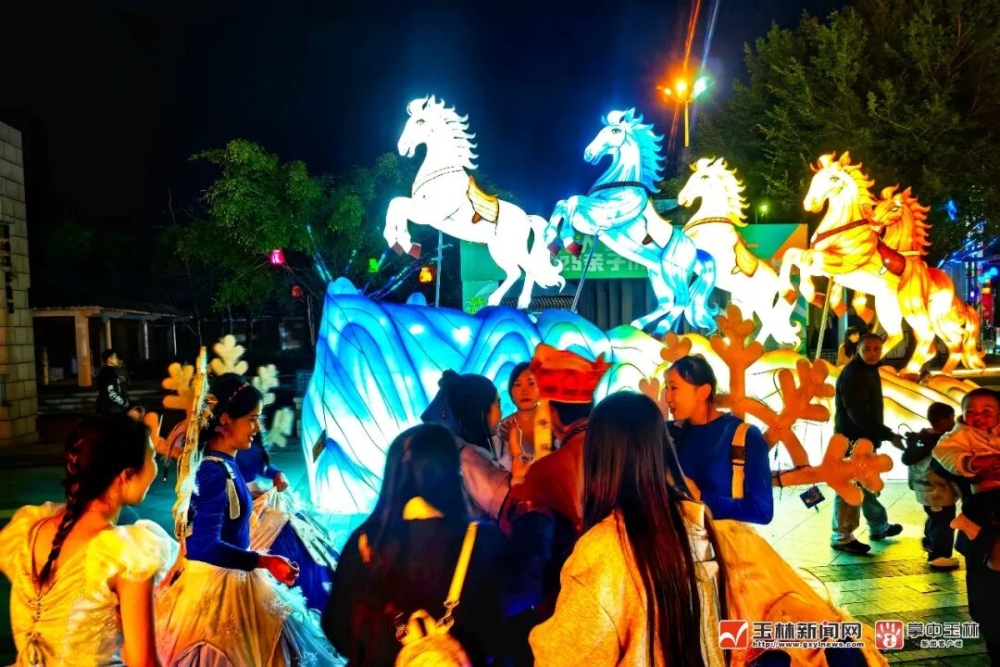 走进玉林园博园第三届新春灯会大门,几匹颜色各异的“骏马”踏在“高山”上跃入游客眼帘,紧扣农历马年主题。游客们竞相与“骏马”合影。“这里的灯会盛景,让人恍若置身仙境,太美了。”来自湖北的游客王女士说,她来玉林和儿子一起过年,看到玉林园博园晚上灯火辉煌,美不胜收,“一下子就感受到了玉林人的快乐”。
