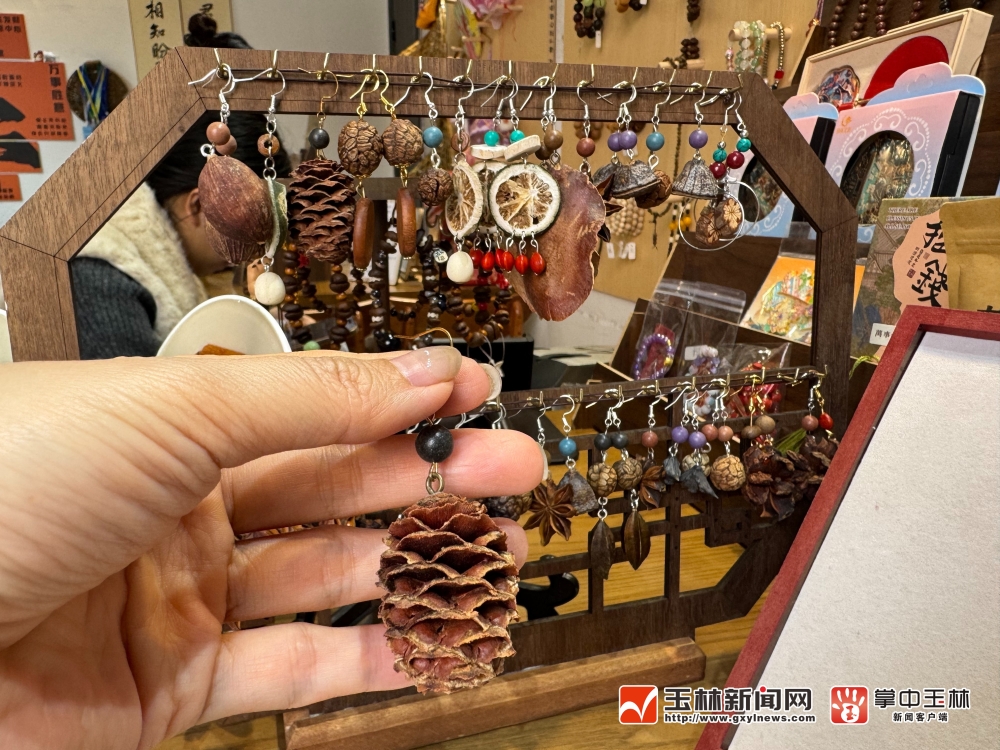 在这间体验馆里,最常见的八角、山药、茯苓等,摇身一变成了极具国风韵味的耳环。完整的八角保留了其独特的星芒形状,经过简单加工,天然的纹理搭配简约的配件,佩戴起来不仅个性十足,还隐隐散发着淡淡的香料香气。