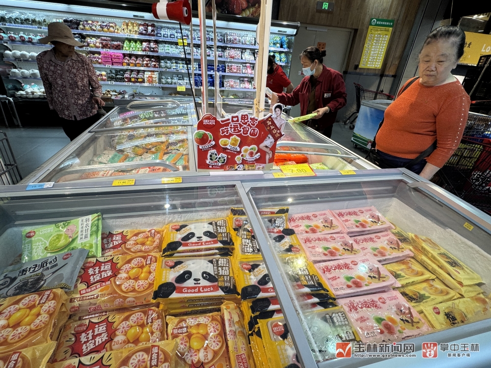 在玉林城区人民中路一家大型超市的冷冻食品区,各种品牌的汤圆口味众多、价格实惠。为了吸引消费者,今年各大品牌纷纷在产品包装和造型上下足功夫。比如一款“联名”人气网游“蛋仔派对”的汤圆产品,外包装上呆萌的蛋仔形象格外吸睛,汤圆也做成蛋仔的形状,吸引了不少小朋友。此外,还有商家走起“富贵路线”,推出造型精致的花朵形状的“有钱花”汤圆。