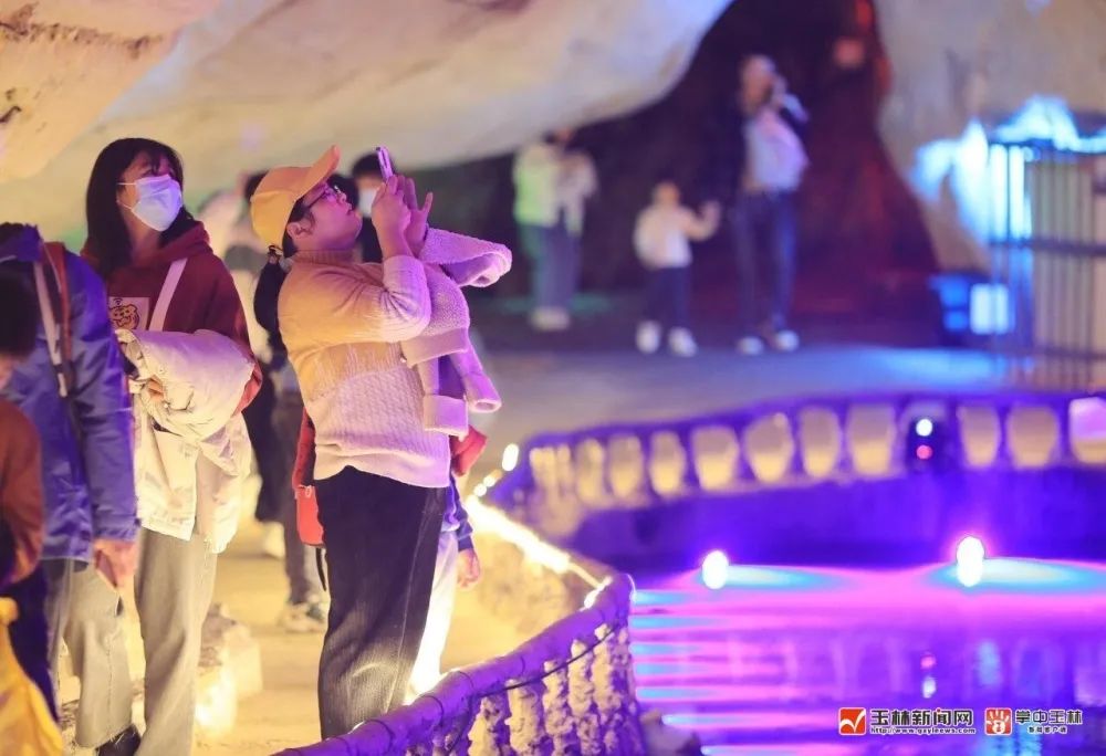 徜徉其中,时而穿过仅通一人的狭窄走廊,时而进入宽敞明丽的大厅。游客们在洞内走走停停,或驻足端详,或拍照留念,不由为大自然的鬼斧神工而感叹不已。“我们是从广东茂名过来的,这里自然的溶洞景观再加上科技光影的元素,确实不错。”游客黄先生一家按线路依次走完宝圭、玉阙、白沙、桃源四洞后告诉记者。