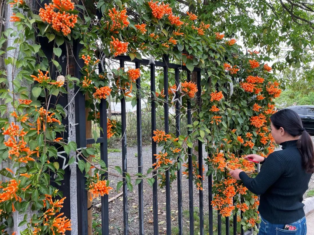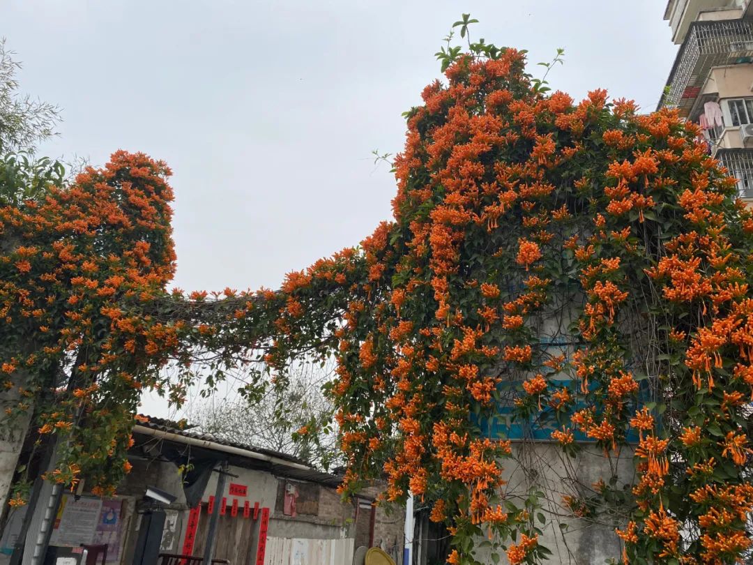 ▲橙红色的炮仗花挂满门梁,像极了打开春天的大门。