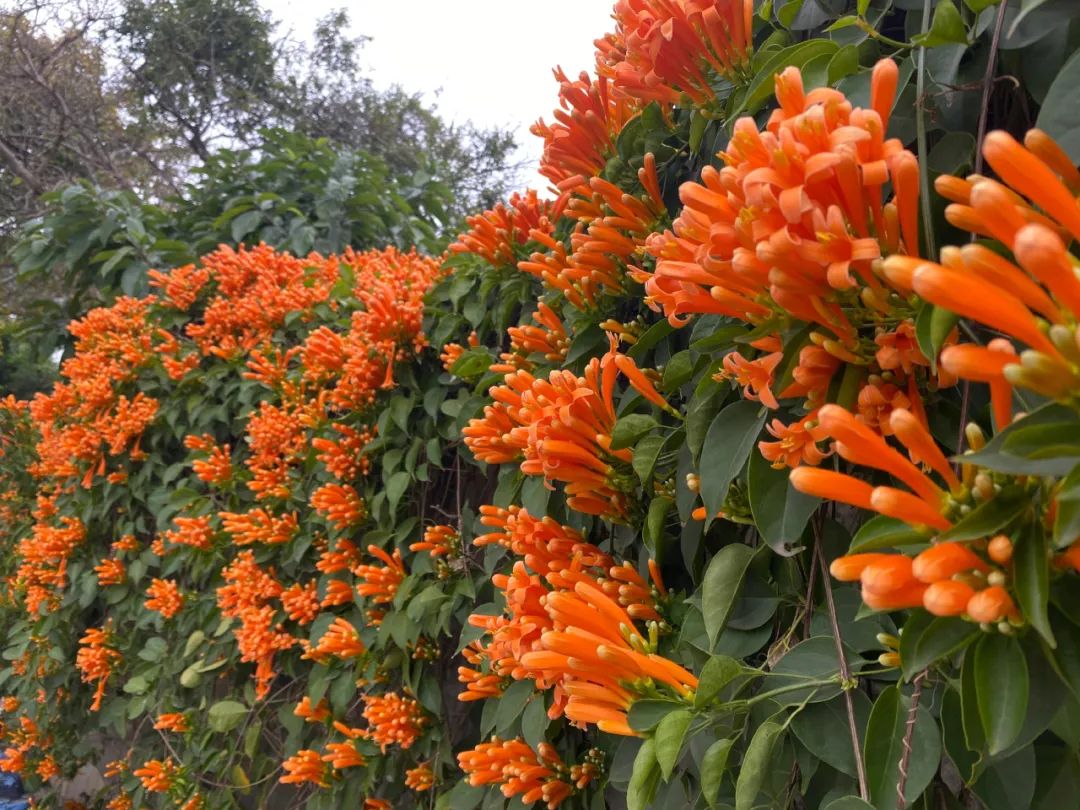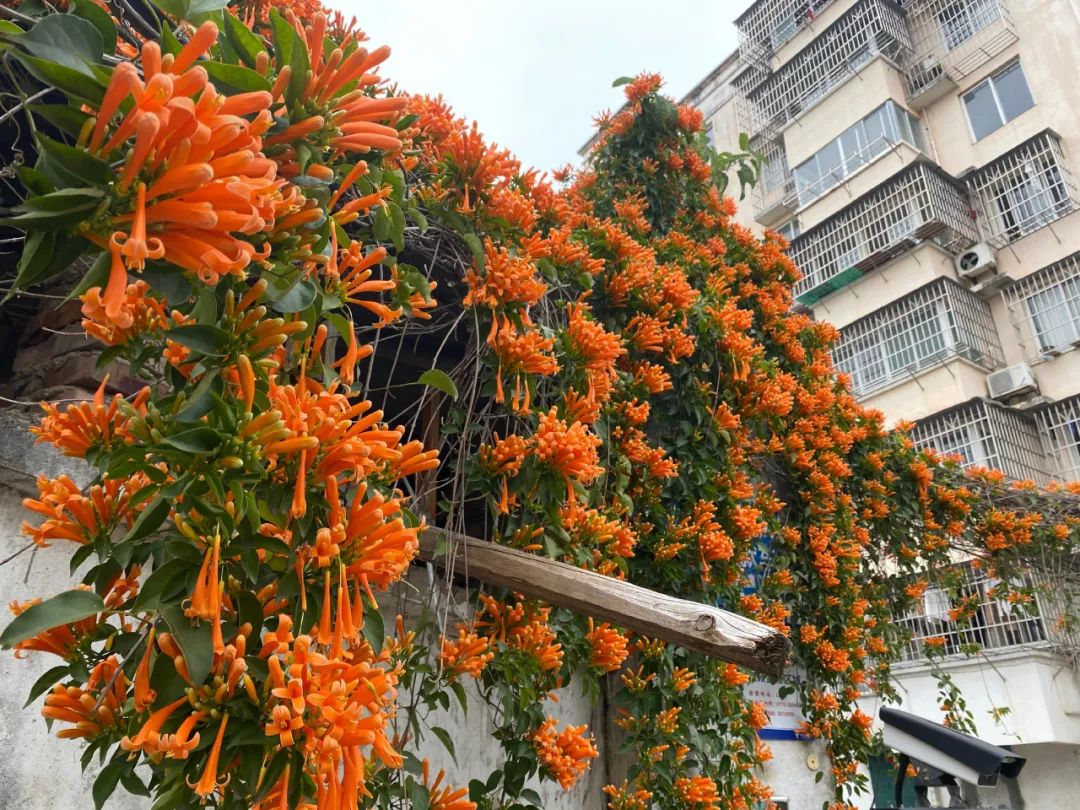 2月18日,记者在玉林机务小区的一处门口发现,门口被密密匝匝、喇叭形橙红色的花朵布满,如一串串鲜艳的鞭炮挂满门廊,又像橙红色的花瀑飞泻而下,像极了打开春天的大门。