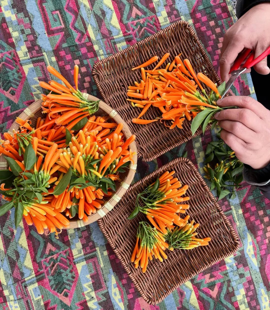 ▲虹姐正在采摘自家种养的炮仗花,以花入馔。