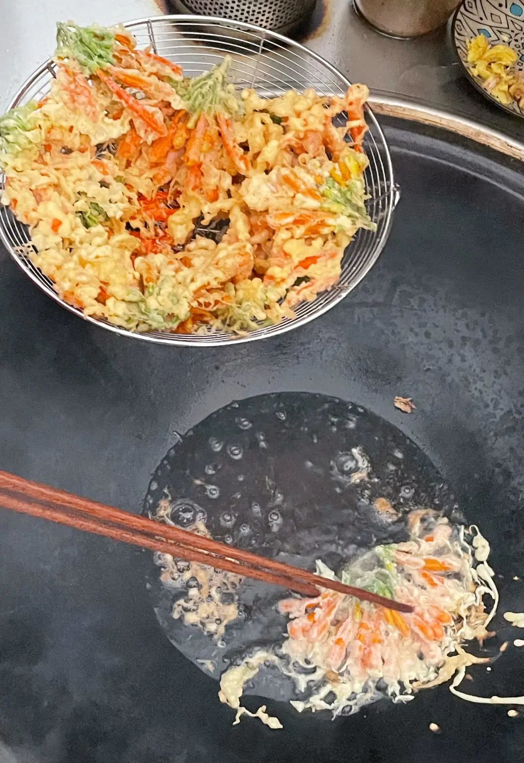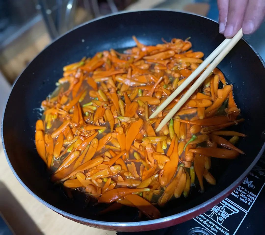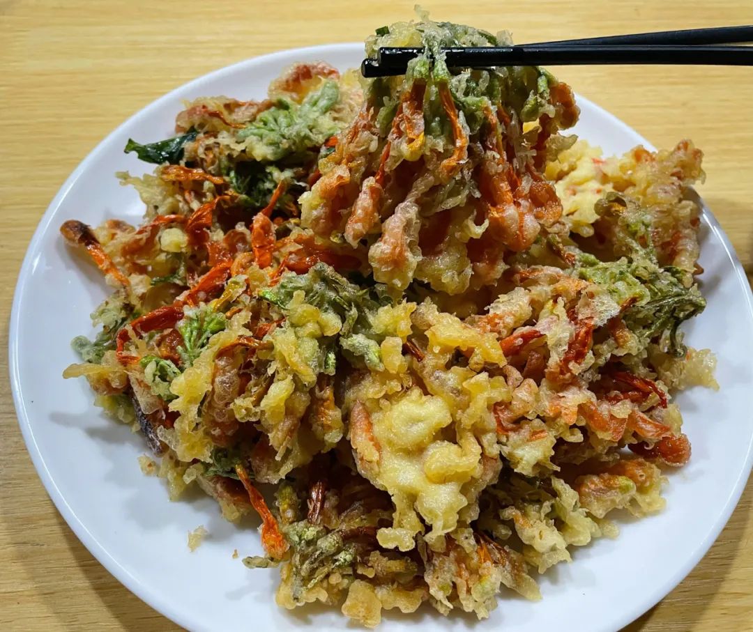 “整朵的可以入油锅炸来吃,一瓣瓣的可以用来煎鸡蛋。”虹姐介绍,炮仗花不仅盛开得热烈喜庆,其性味甘、平,还有润肺止咳、清热利咽的功效。采摘下来的炮仗花,稍微挑选一下,洗净,去掉花茎,加入面粉、鸡蛋、盐搅拌均匀,用整朵炮仗花蘸取,随后放入锅中一朵朵油炸至酥脆即可。一口咬下,花香酥脆,充满整个口腔。